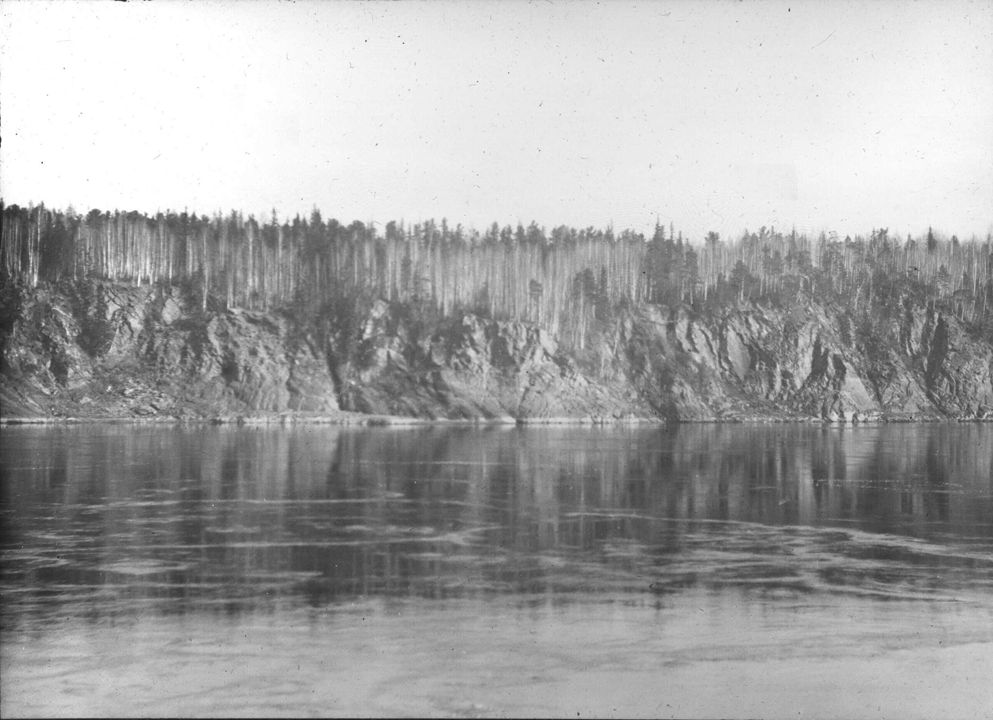 Остров Осиновский порог на реке Енисей. На заднем плане - крутой берег, на вершине откоса - хвойный лес. Автор: В.А. Зевеке Место события: река Енисей Дата: 18 сентября 1914 г.