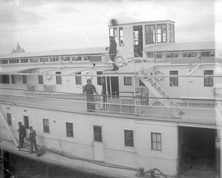 Пароход у причала. На заднем плане – собор Александра Невского. Дата: к. XIX н.XX вв. Место съемки: г. Н.Новгород Автор: В.А. Зевеке