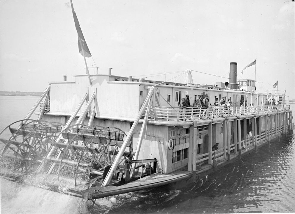 Общий вид заднеколесного парохода. Автор: В.А. Зевеке Место события: г. Астрахань Дата: 1908 г.