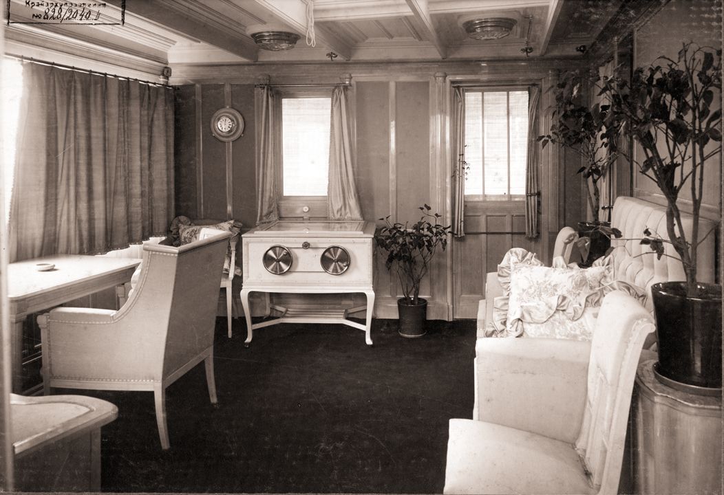 Визит Николая II на празднование 300-летия дома Романовых в г. Н.Новгород. Салон парохода «Межень», на котором Николай II отбыл из Нижнего Новгорода. Дата: 1913 г. Место съемки: г. Н.Новгород Автор: М.П. Дмитриев