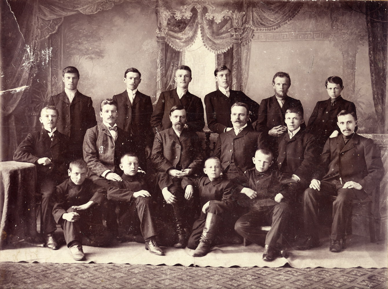 Фотограф неизвестен. Село Павлово, Горбатовский уезд. Торговцы кустарными металлическими изделиями братья Арсений и Николай Лобковские (1ряд 2и 4 слева) с работниками. Начало ХХ в.