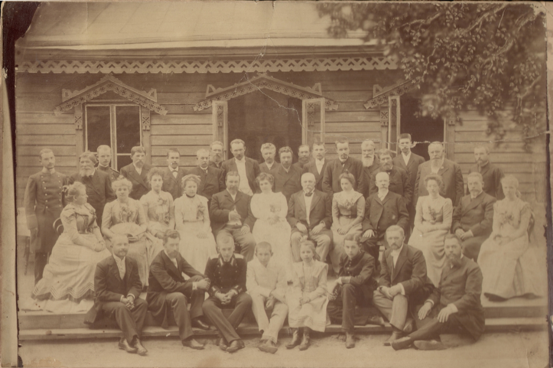 Наталия Павловна Дурдина с матерью и неизвестными женщинами у лестницы перед домом