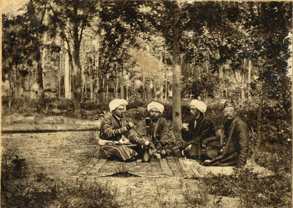 Четверо человек в восточных одеждах (халатах и чалмах), сидящих на ковре в парке