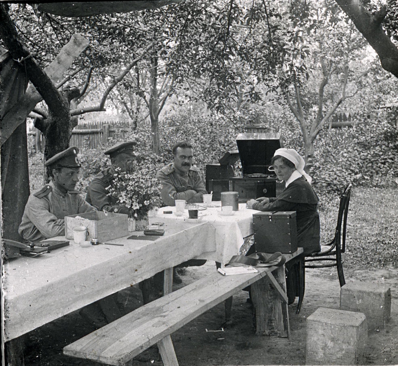 Наталия Павловна Дурдина с матерью и неизвестными женщинами у лестницы перед домом