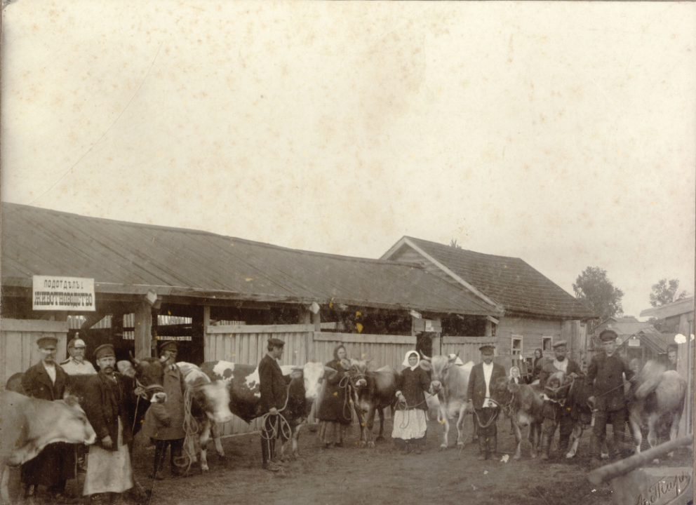 Группа крестьян с коровами около павильона животноводства Мологской Уездной сельскохозяйственной и кустарной выставки 1912 года