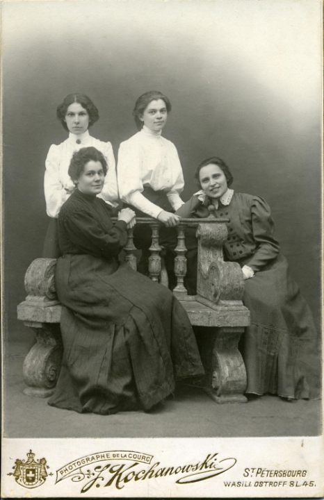 Наталия Павловна Дурдина с матерью и неизвестными женщинами у лестницы перед домом