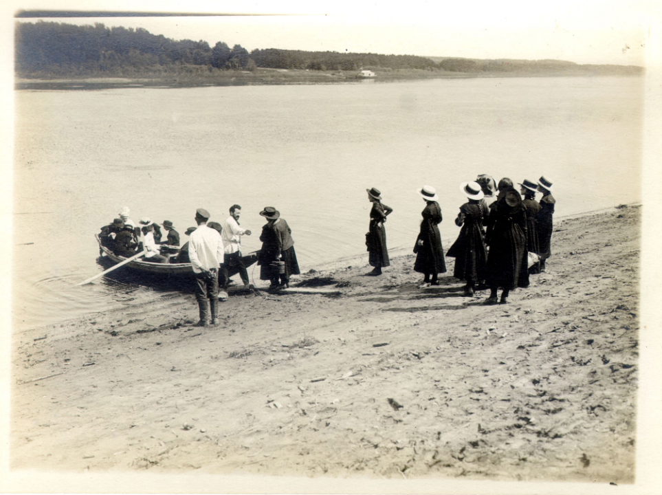 Ученицы Мариинской гимназии переправляются на лодке через Волгу