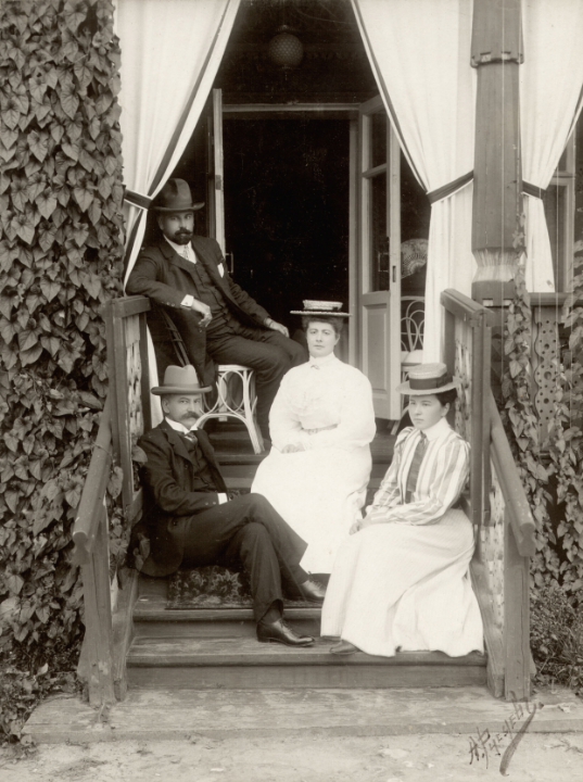 Наталия Павловна Дурдина с матерью и неизвестными женщинами у лестницы перед домом