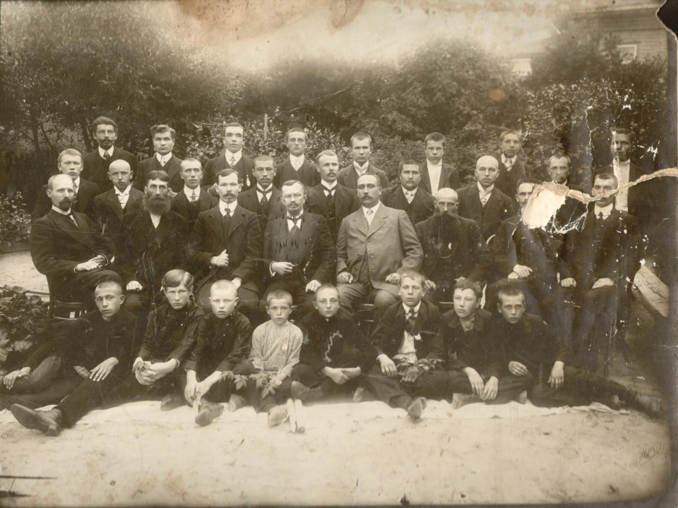 Группа служащих и мальчиков фабрики Кузнецова в Песочном.