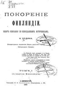 К. Ф. Ордин в 1889 году издал большое двухтомное исследование «Покорение Финляндии», в котором на основании отысканных им, большей частью ранее нигде не напечатанных источников, изложил историю покорения Финляндии русскими и утверждения в ней русской власти. Это исследование было удостоено Императорской Академией Наук премии имени митрополита Макария.