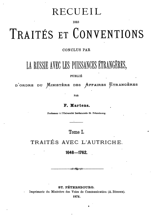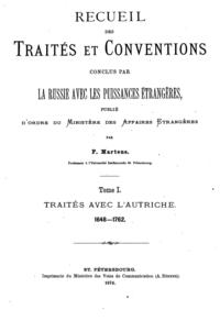 «Собрание Трактатов и Конвенций, заключенных Россией с иностранными державами» — публикация документов дипломатической истории России XVII-XX вв., изданная в 15 томах в 1874-1909 Ф. Ф. Мартенсом. «Собрание» включает документы о взаимоотношениях России с Австрией (и Австро-Венгрией) — т. 1-4; с Пруссией (Германией) — т. 5-8; с Англией — т. 9-12; с Францией — т. 13-15. Все документы воспроизведены на языке подлинника и даны в русском переводе. Каждому тому предпослано введение, многие тексты договоров снабжены комментариями. Собрание Мартенса являлось наиболее полной публикацией такого рода, многие соглашения и секретные статьи к ним были воспроизведены впервые.