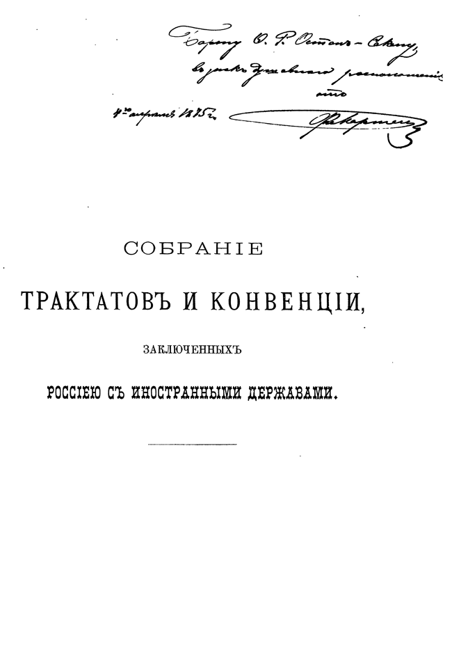 «Собрание Трактатов и Конвенций, заключенных Россией с иностранными державами» — публикация документов дипломатической истории России XVII-XX вв., изданная в 15 томах в 1874-1909 Ф. Ф. Мартенсом. «Собрание» включает документы о взаимоотношениях России с Австрией (и Австро-Венгрией) — т. 1-4; с Пруссией (Германией) — т. 5-8; с Англией — т. 9-12; с Францией — т. 13-15. Все документы воспроизведены на языке подлинника и даны в русском переводе. Каждому тому предпослано введение, многие тексты договоров снабжены комментариями. Собрание Мартенса являлось наиболее полной публикацией такого рода, многие соглашения и секретные статьи к ним были воспроизведены впервые.