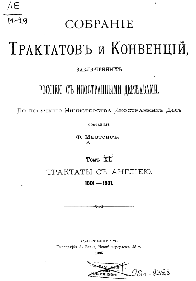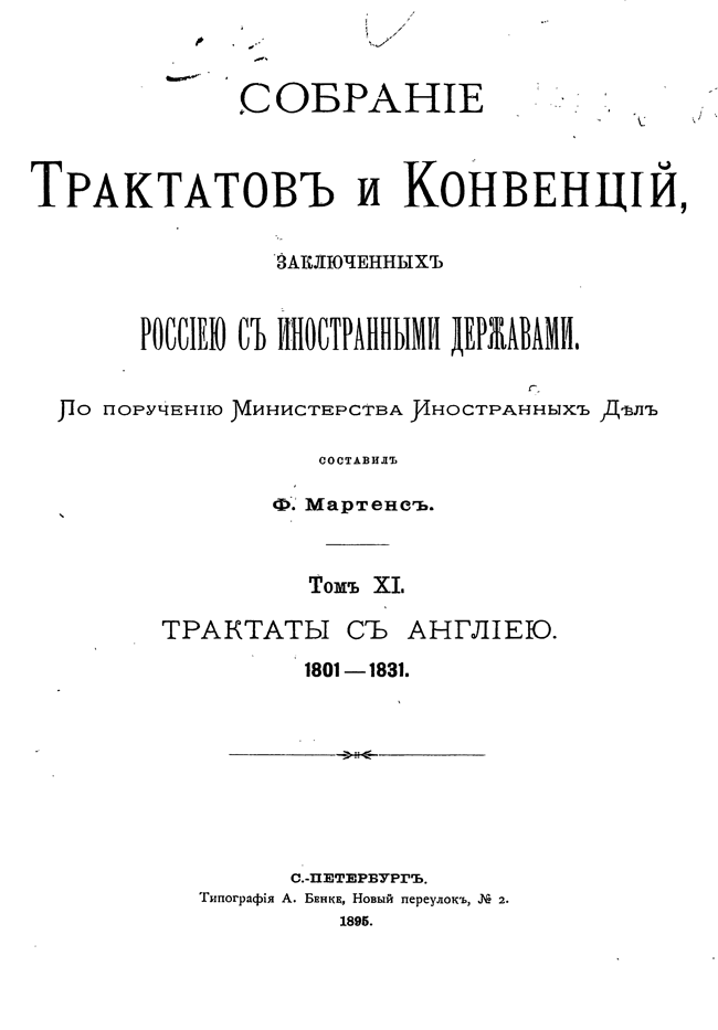 Собрание Трактатов и Конвенций, заключенных Россией с иностранными державами. Том XI. Трактаты с Англией.
