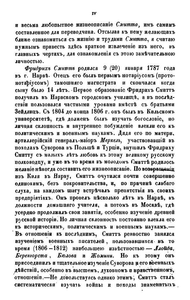 Эта книга долгое время считалась наиболее ценнной биографией великого русского полководца. Несмотря на название, основное внимание уделено имено жизни самого Суворова, Для себя Смитт выдвинул следующие цели: 1) изобразить правдиво падение Польской республики и, в тоже время, жизнь и подвиги Суворова 2) опровергнуть ложное мнение о Суворове, существовавшее в Западной Европе и, особенно, Германии 3) показать актами и документами истинное величие такого человека, как Суворов. Со всеми этими задачами автор вполне справился.
