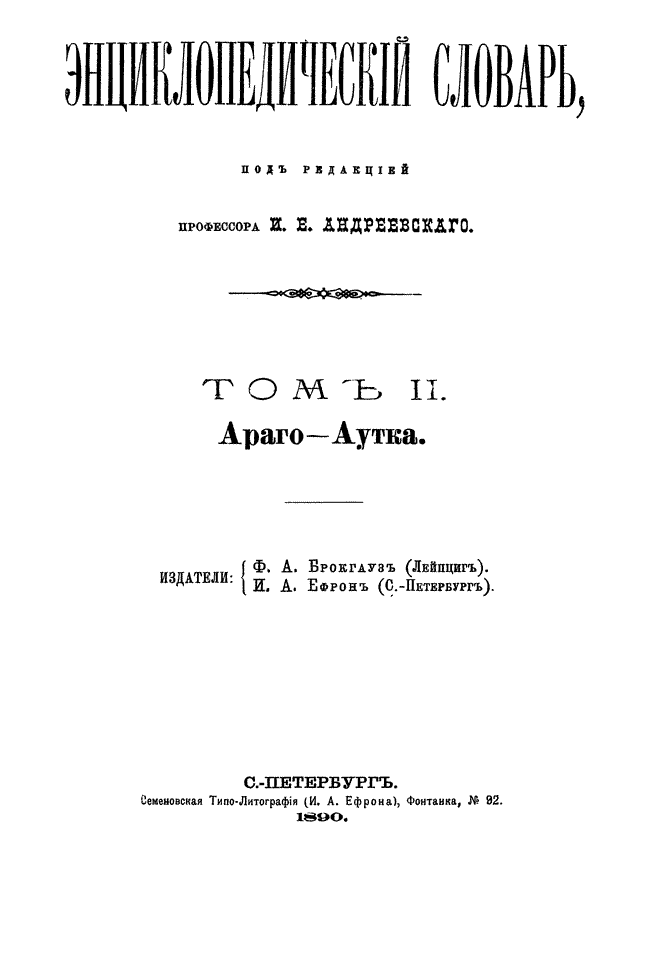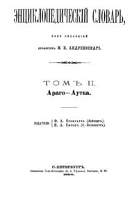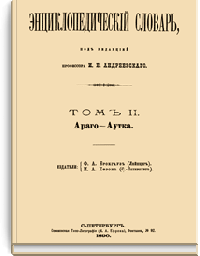 Самая крупная дореволюционная русская универсальная энциклопедия, выпущенная акционерным издательским обществом «Ф. А. Брокгауз — И. А. Ефрон». Состоит из 86 томов (82 основных и 4 дополнительных), выходивших в течение 1890-1907 годов. Первые 8 томов (до буквы «В») вышли под общей редакцией профессора И. Е. Андреевского и в основном содержали переводы на русский язык статей знаменитой немецкой энциклопедии Брокгауза «Konversations Lexikon».
