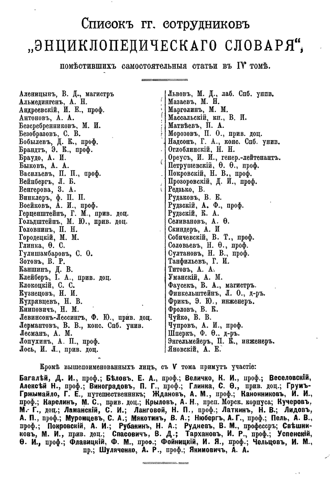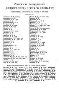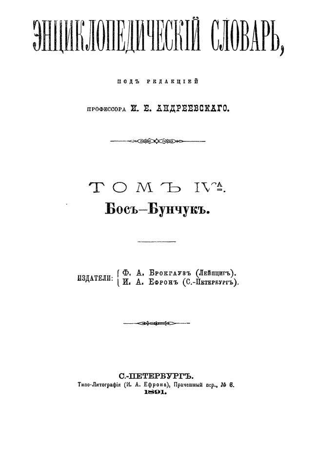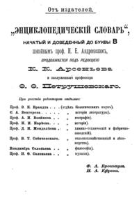 Самая крупная дореволюционная русская универсальная энциклопедия, выпущенная акционерным издательским обществом «Ф. А. Брокгауз — И. А. Ефрон». Состоит из 86 томов (82 основных и 4 дополнительных), выходивших в течение 1890-1907 годов. Первые 8 томов (до буквы «В») вышли под общей редакцией профессора И. Е. Андреевского и в основном содержали переводы на русский язык статей знаменитой немецкой энциклопедии Брокгауза «Konversations Lexikon».