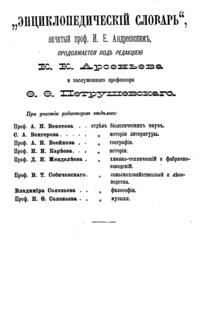 Самая крупная дореволюционная русская универсальная энциклопедия, выпущенная акционерным издательским обществом «Ф. А. Брокгауз — И. А. Ефрон». Состоит из 86 томов (82 основных и 4 дополнительных), выходивших в течение 1890-1907 годов. Первые 8 томов (до буквы «В») вышли под общей редакцией профессора И. Е. Андреевского и в основном содержали переводы на русский язык статей знаменитой немецкой энциклопедии Брокгауза «Konversations Lexikon».