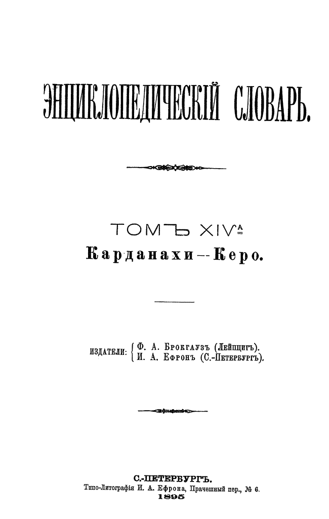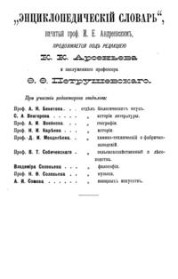 Самая крупная дореволюционная русская универсальная энциклопедия, выпущенная акционерным издательским обществом «Ф. А. Брокгауз — И. А. Ефрон». Состоит из 86 томов (82 основных и 4 дополнительных), выходивших в течение 1890-1907 годов. Первые 8 томов (до буквы «В») вышли под общей редакцией профессора И. Е. Андреевского и в основном содержали переводы на русский язык статей знаменитой немецкой энциклопедии Брокгауза «Konversations Lexikon».