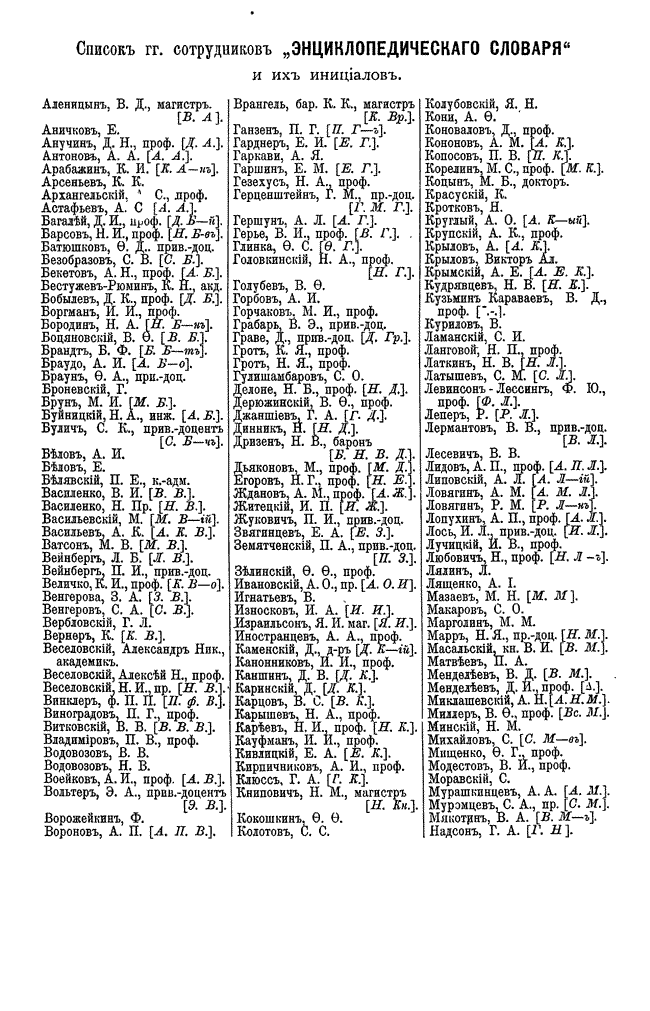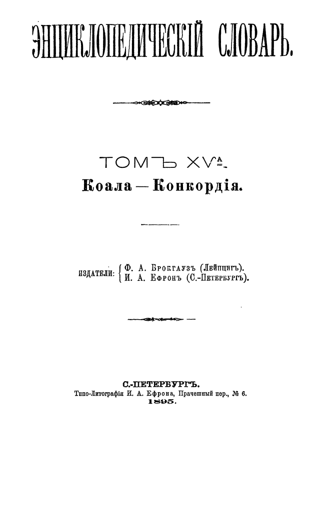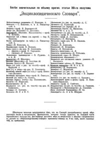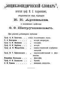 Самая крупная дореволюционная русская универсальная энциклопедия, выпущенная акционерным издательским обществом «Ф. А. Брокгауз — И. А. Ефрон». Состоит из 86 томов (82 основных и 4 дополнительных), выходивших в течение 1890-1907 годов. Первые 8 томов (до буквы «В») вышли под общей редакцией профессора И. Е. Андреевского и в основном содержали переводы на русский язык статей знаменитой немецкой энциклопедии Брокгауза «Konversations Lexikon».