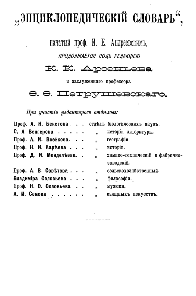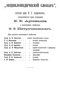 Самая крупная дореволюционная русская универсальная энциклопедия, выпущенная акционерным издательским обществом «Ф. А. Брокгауз — И. А. Ефрон». Состоит из 86 томов (82 основных и 4 дополнительных), выходивших в течение 1890-1907 годов. Первые 8 томов (до буквы «В») вышли под общей редакцией профессора И. Е. Андреевского и в основном содержали переводы на русский язык статей знаменитой немецкой энциклопедии Брокгауза «Konversations Lexikon».