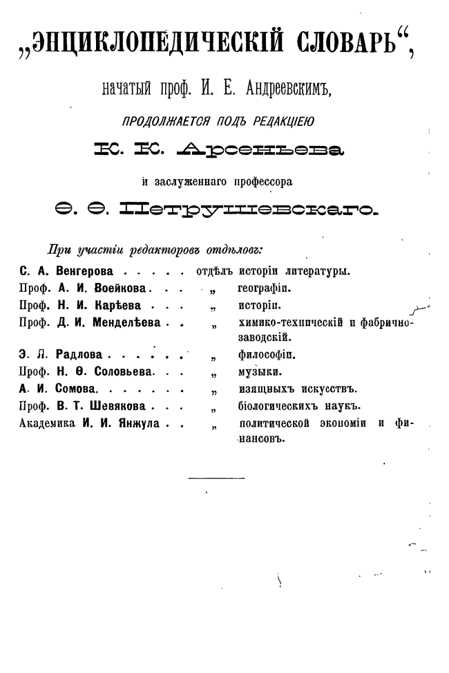 После кончины Андреевского новая редакция во главе с К. К. Арсеньевым и Ф. Ф. Петрушевским значительно увеличила число оригинальных статей и привлекла к сотрудничеству широкий круг общественно-политических деятелей либерального толка (от П. Н. Милюкова, В. И. Герье, Н. И. Кареева до легальных марксистов П. Б. Струве и М. И. Туган-Барановского, раздел философии вел крупнейший русский религиозный философ Вл. С. Соловьев), а также таких крупнейших ученых как Д. И. Менделеев, А. И. Бекетов, А. И. Воейков, Д. И. Анучин, Ю. М. Шокальский, Н. М. Книпович, А. О. Ковалевский, А. И. Советов, В. С. Соловьев и др.