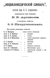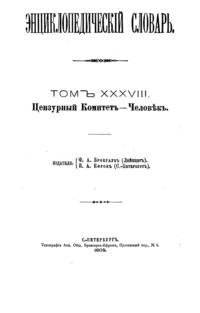 Самая крупная дореволюционная русская универсальная энциклопедия, выпущенная акционерным издательским обществом «Ф. А. Брокгауз — И. А. Ефрон». Состоит из 86 томов (82 основных и 4 дополнительных), выходивших в течение 1890-1907 годов. Первые 8 томов (до буквы «В») вышли под общей редакцией профессора И. Е. Андреевского и в основном содержали переводы на русский язык статей знаменитой немецкой энциклопедии Брокгауза «Konversations Lexikon».