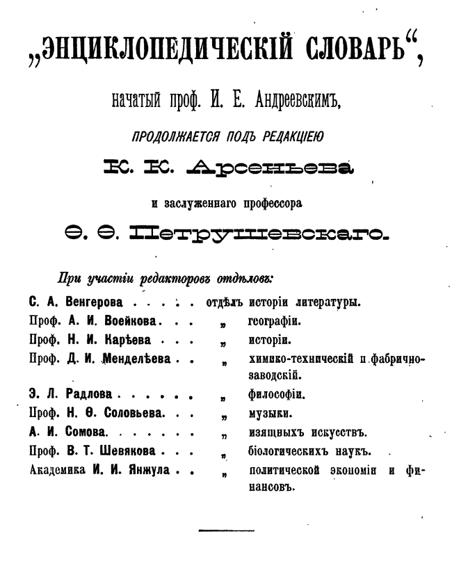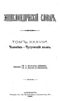 Самая крупная дореволюционная русская универсальная энциклопедия, выпущенная акционерным издательским обществом «Ф. А. Брокгауз — И. А. Ефрон». Состоит из 86 томов (82 основных и 4 дополнительных), выходивших в течение 1890-1907 годов. Первые 8 томов (до буквы «В») вышли под общей редакцией профессора И. Е. Андреевского и в основном содержали переводы на русский язык статей знаменитой немецкой энциклопедии Брокгауза «Konversations Lexikon».