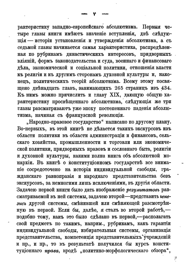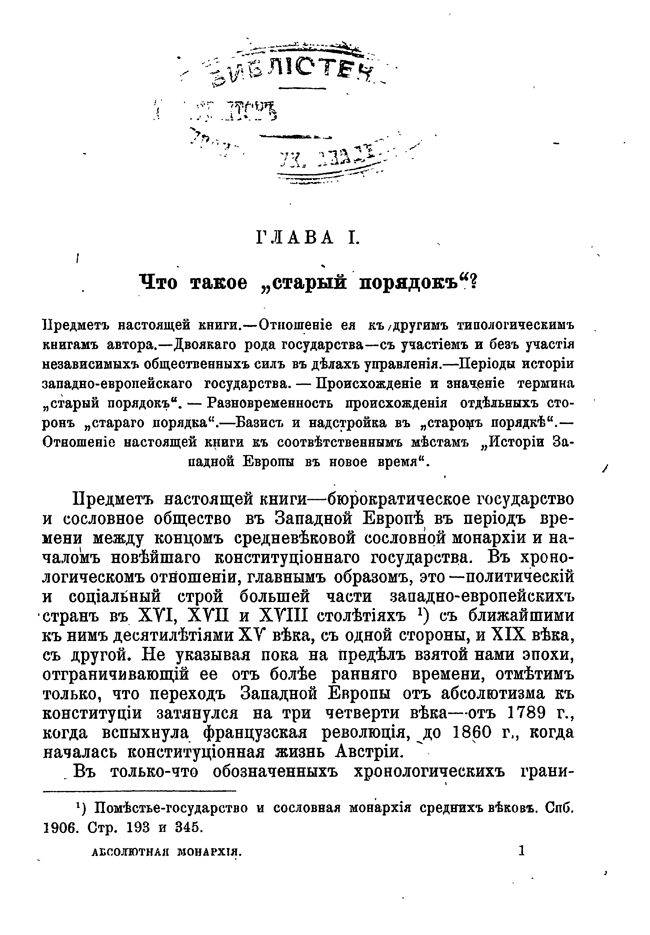 Основная задача представленной книги — дать общую характеристику западно-европейского абсолютизма. Первые четыре главы книги имеют значение вступления, две следующие — истории установления и утверждения абсолютизма, а с седьмой главы начинается сама характеристика, распределенная по рубрикам династических интересов, придворных влияний, форм законодательства и суда, военного и финансового дела, экономической и социальной политики, отношения власти к религии и к другим сторонам духовной культуры и, наконец, политических теорий абсолютизма.