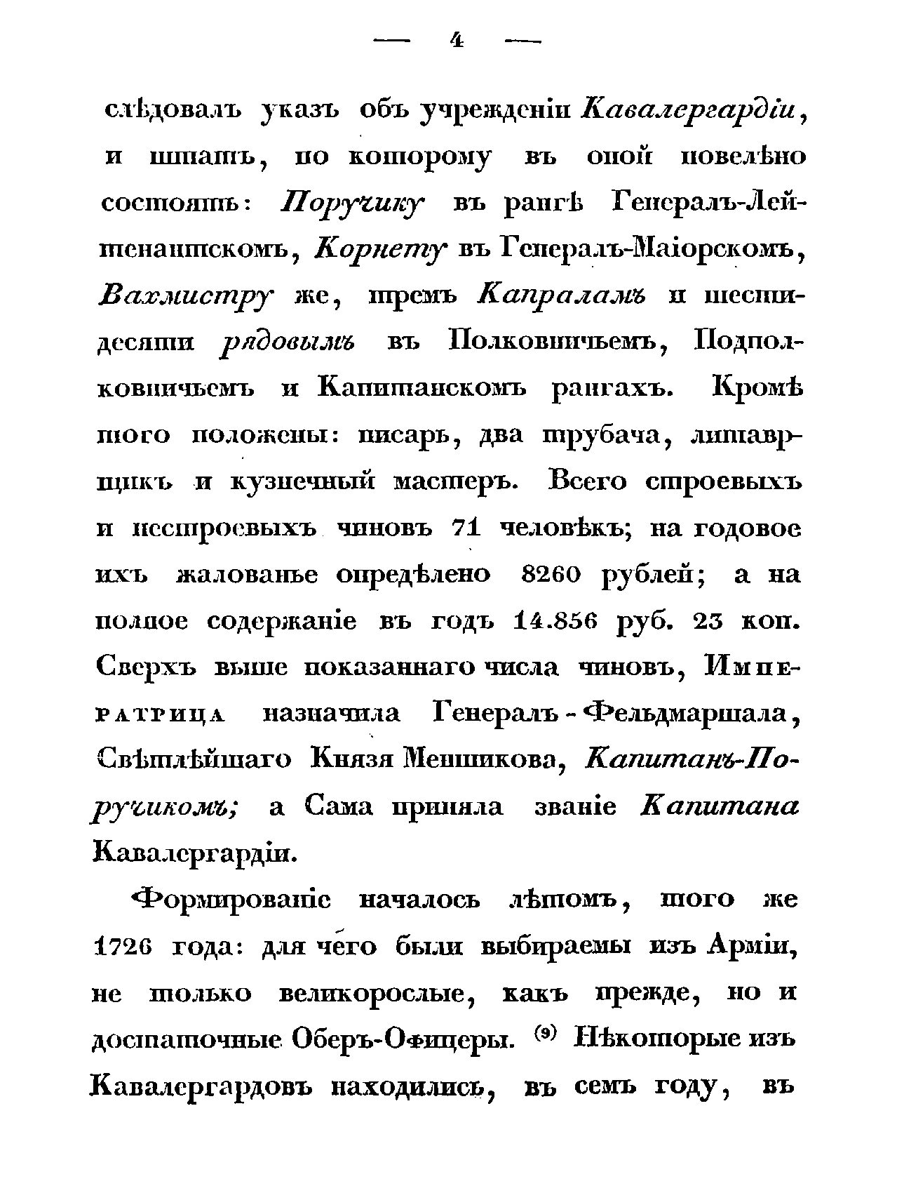 Документальное описание боевых действий полка и знаменательных исторических событий, связанных с ним, за период 1724 – 1832 годов. Приведены поименные списки командиров и офицеров полка, сравнительные таблицы штатного числа чинов и окладного жалования, описания униформы, вооружения и штандартов.