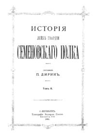В 1883 г. в Санкт-Петербурге вышло в свет двухтомное издание, посвященное истории лейб-гвардии Семеновского полка, составленное поручиком Петром Дириным. Один из старейших полков российской армии — Семеновский — был сформирован в конце XVII века в подмосковном селе Семеновском из «потешных войск», созданных для забавы царевича Петра. В 1700 г. полк стал лейб-гвардейским, принимал участие во многих войнах, подавлении мятежей и дворцовых переворотах; в нем начинали военную службу генералиссимус А. В. Суворов-Рымникский, флотоводец А. Г. Орлов-Чесменский и фельдмаршал И. И. Дибич-Забалканский; его шефами были императоры и великие князья. Альбом иллюстраций состоит из двух листов текста и 38-ми отдельных листов монохромных изображений. На страницах альбома представлены портреты императоров, императриц, великих князей, командиров лейб-гвардии, рисунки форм обмундирования различных воинских чинов, а также иллюстрации крупнейших сражений Семеновского полка.