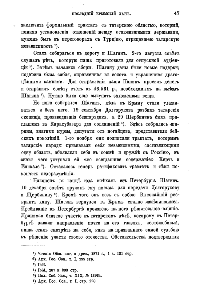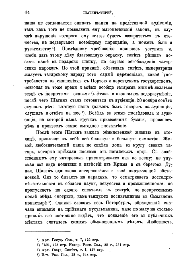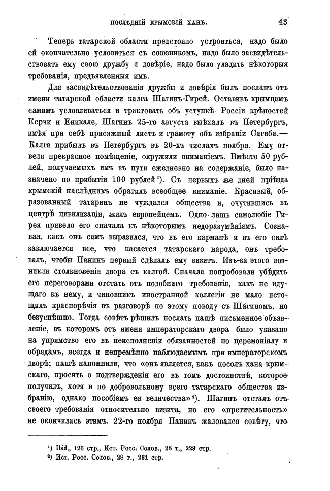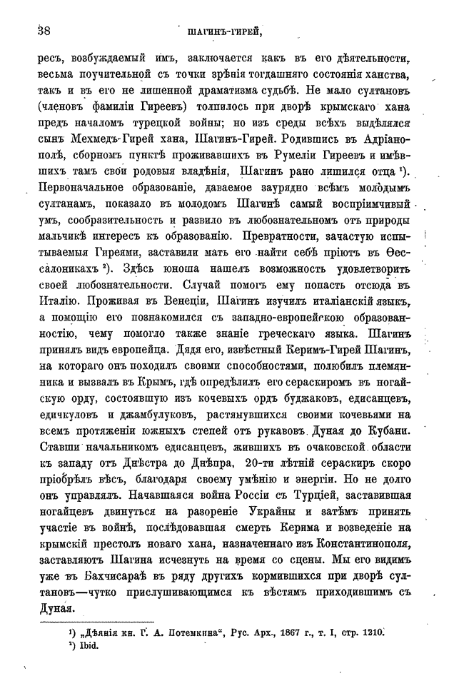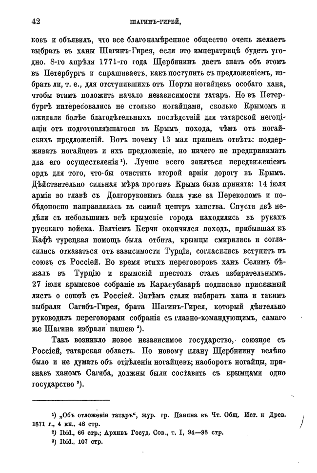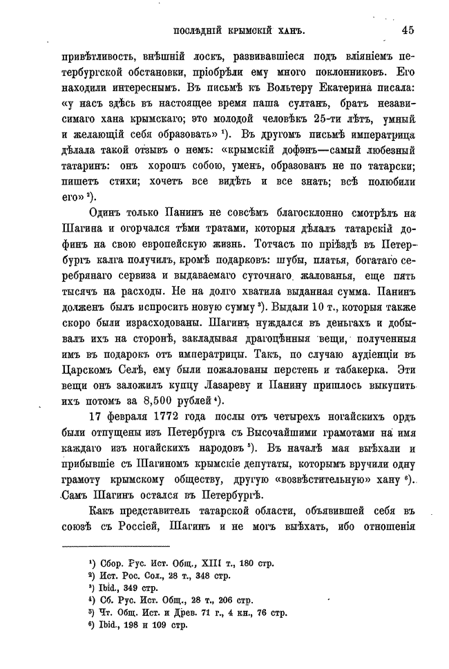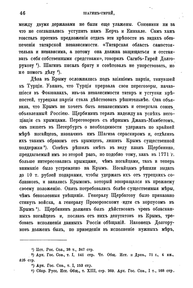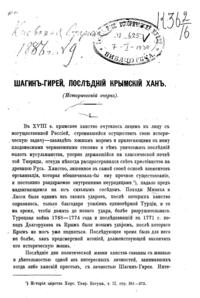 Широко освещена деятельность Шагин-Гирея до занятия им ханского трона, его реформы и историческая роль в присоединении Крымского ханства к Российской империи, а также то, как в конце концов этот незаурядный татарский правитель пал жертвой обмана и политических интриг Екатерины II—об этом достаточно очевидно следует из контекст.