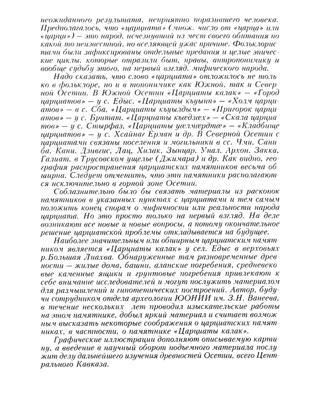 Наиболее значительным и обширным царциатским памятником является «Царциаты калак» у сел. Едыс. Обнаруженные там разновременные древности – жилые дома, башни, аланские погребения, средневековые каменные ящики и групповые погребения привлекают к себе внимание исследователей и могут послужить материалом для размышлений и гипотетических построений. Автор работы, Р.Г. Дзаттиаты, будучи сотрудником отдела арехеологии ЮОНИИ им. З.Н. Ванеева, в течение нескольких лет проводил изыскательные работы на этом памятнике, добыл яркий материал и считает возможным высказать некоторые соображения о царциатских памятниках, в частности, о памятнике «Царциаты калак».