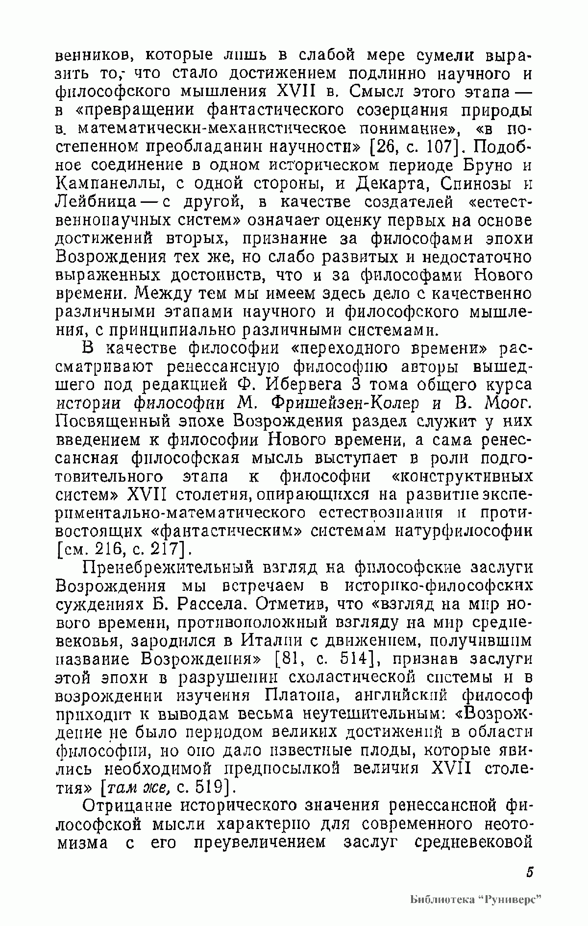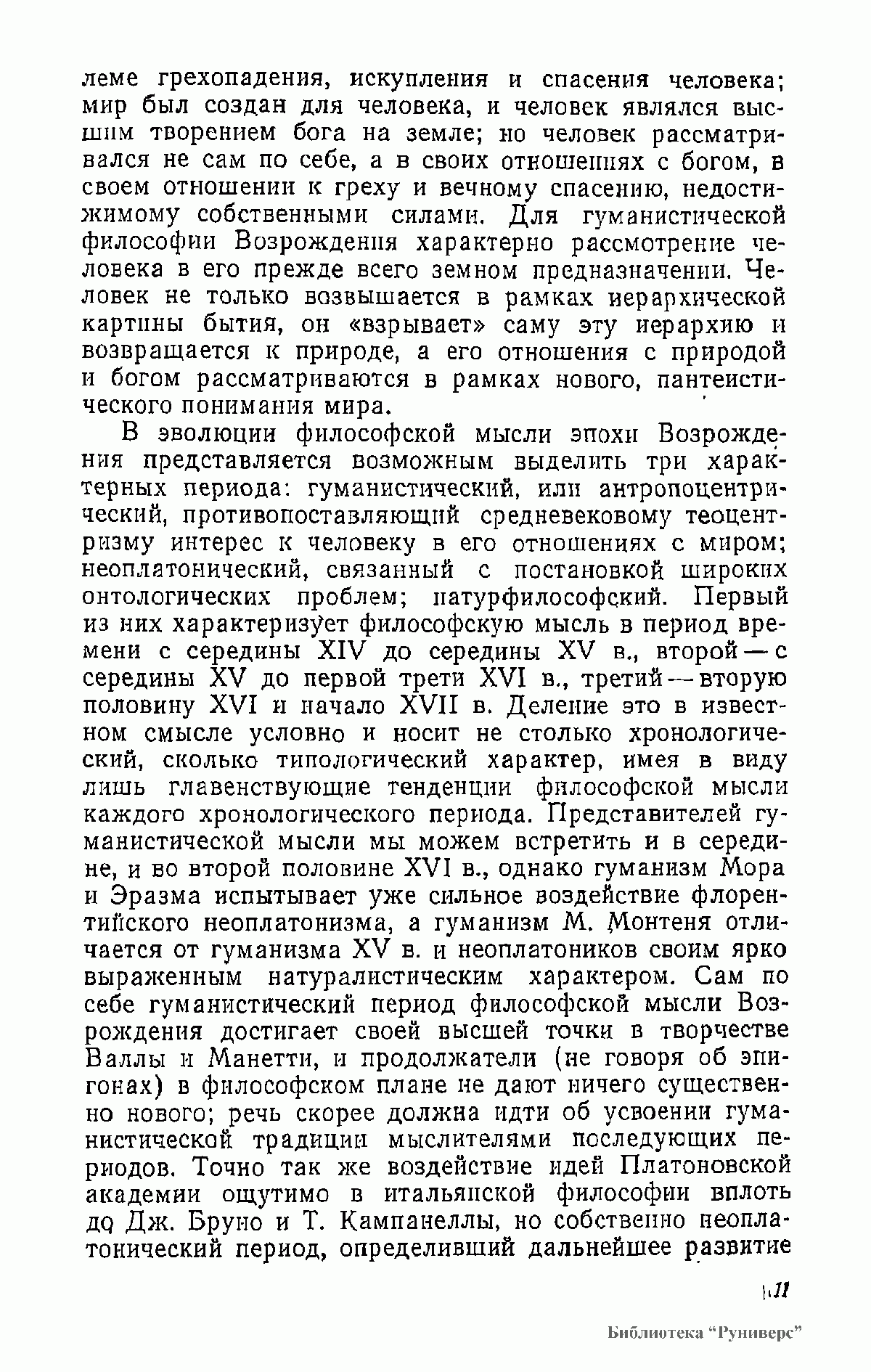 В книге анализируются философские и социологические взгляды Данте, Ф. Петрарки, Николая из Кузы, Леонардо да Винчи, Н. Коперника, М. Монтеня, Дж. Бруно, Т. Кампанеллы, Г. Галилея и др. Работа основана на многочисленных источниках, прежде всего на подлинных текстах философов XIV—XVI вв., по большей части не переводившихся на русский язык; она содержит аргументированную критику буржуазно-идеалистических и клерикальных истолкований философского наследия эпохи Возрождения.