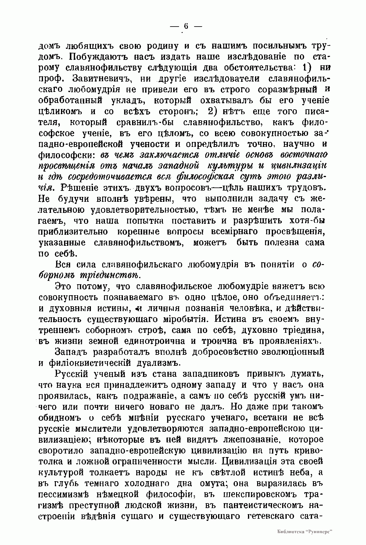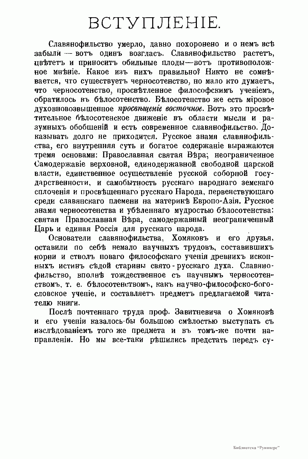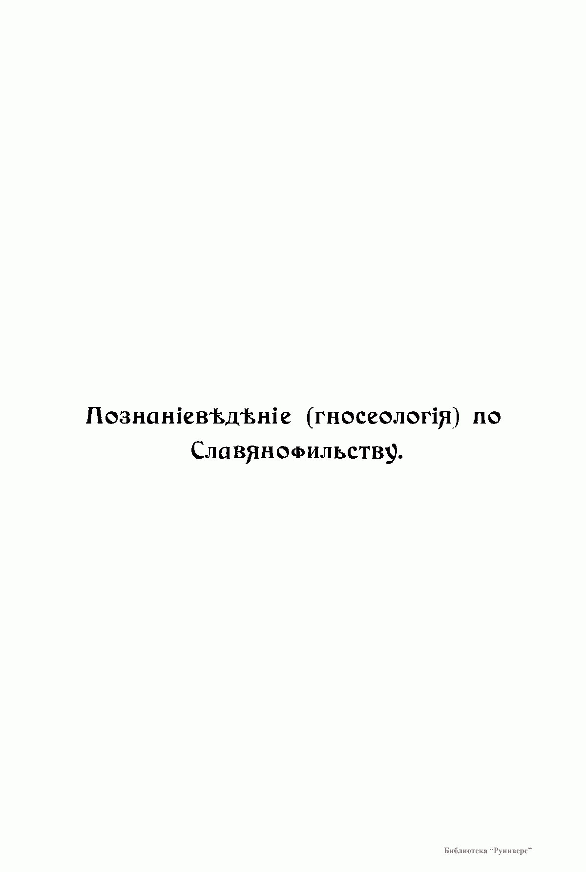 Два обстоятельства побудили автора издать исследование по "старому славянофильству": 1) то, что исследователи славянофильского любомудрия не привели его в строго соразмерный и обработанный уклад, который охватывал бы его учение целикомъ и со всех сторон; 2) что нет еще писателя, который сравнил бы славянофильство, как философское учение, в его целом, со всею совокупностью западно-европейской учености и определил точно, научно и философски: в чем заключается отличие основ восточного просвещения от начал западной культуры и цивилизации и где сосредоточивается вся философская суть этого различия. Решение этих двух вопросов — цель усилий Михаила Фердинандовича Таубе, который нe будучи вполне уверенным, что выполнил задачу с "желательною удовлетворительностью", тем не менее полагает, что его попытка поставить и разрешить хотя-бы приблизительно "коренные вопросы всемирного просвещеня", указанные славянофильством, можетъ быть полезна сама по себе.