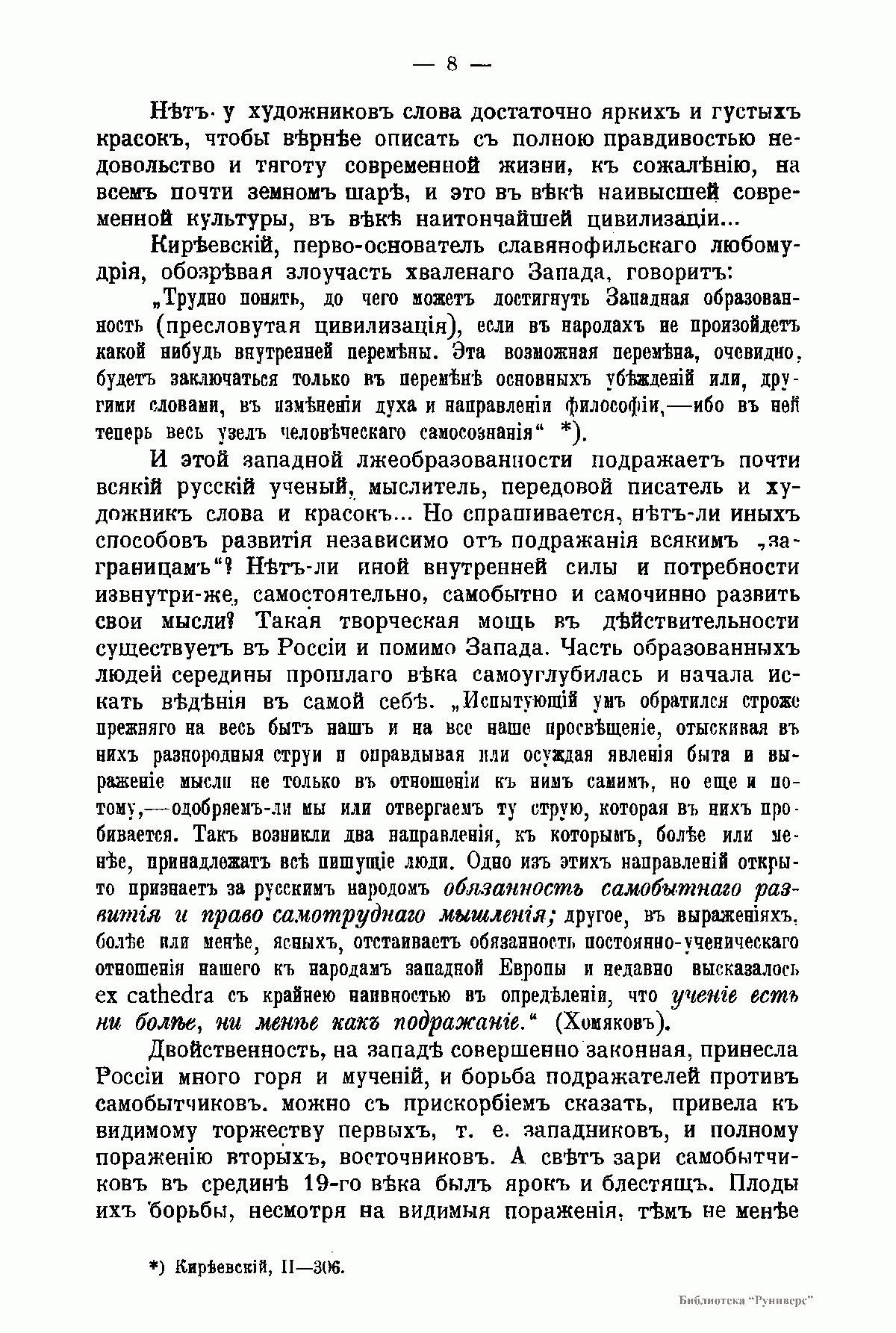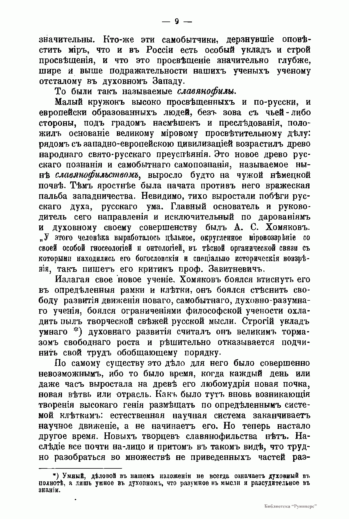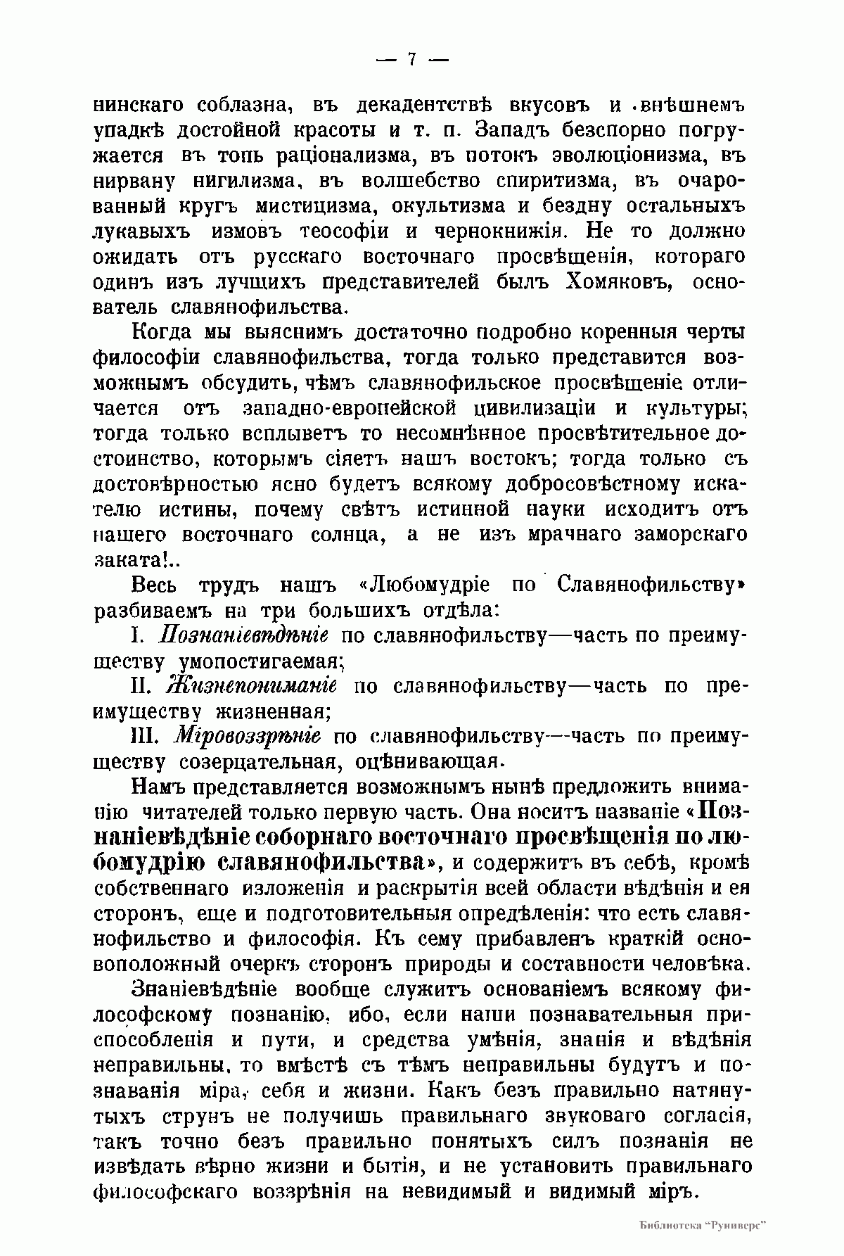 Два обстоятельства побудили автора издать исследование по "старому славянофильству": 1) то, что исследователи славянофильского любомудрия не привели его в строго соразмерный и обработанный уклад, который охватывал бы его учение целикомъ и со всех сторон; 2) что нет еще писателя, который сравнил бы славянофильство, как философское учение, в его целом, со всею совокупностью западно-европейской учености и определил точно, научно и философски: в чем заключается отличие основ восточного просвещения от начал западной культуры и цивилизации и где сосредоточивается вся философская суть этого различия. Решение этих двух вопросов — цель усилий Михаила Фердинандовича Таубе, который нe будучи вполне уверенным, что выполнил задачу с "желательною удовлетворительностью", тем не менее полагает, что его попытка поставить и разрешить хотя-бы приблизительно "коренные вопросы всемирного просвещеня", указанные славянофильством, можетъ быть полезна сама по себе.