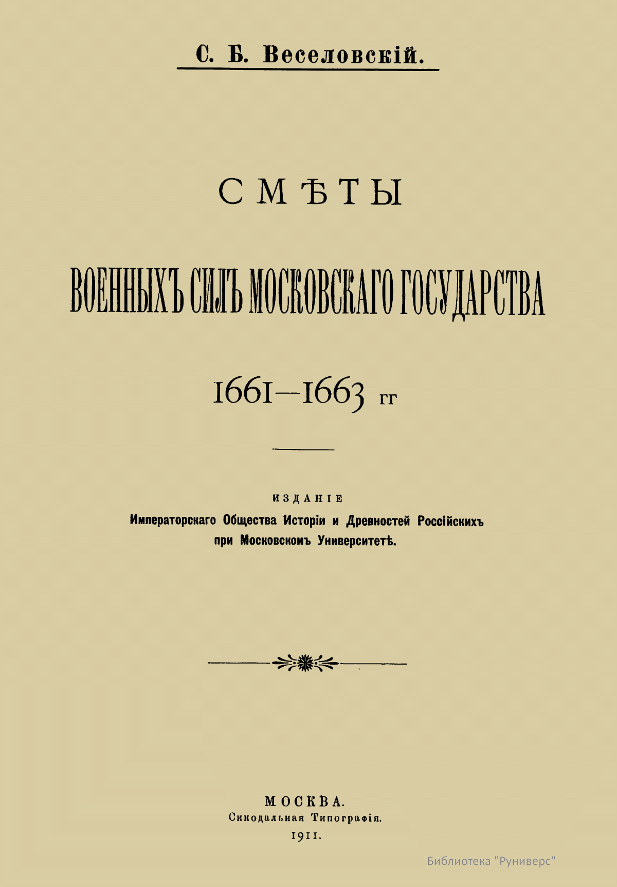 Опубликованный в 1911 году сборник «Сметы военных сил Московского государства 1661–1663 гг.» представляет собой уникальный комплекс служебных документов XVII века, фиксирующих численность, состав, размещение и материальное обеспечение армии Русского царства. В них отражены структура войск — от рейтаров и драгун до стрельцов и казаков, размеры жалования, налоговые механизмы их содержания, а также социальный состав служилого сословия. Источник позволяет реконструировать организацию вооружённых сил и понять процессы формирования регулярной армии в допетровской России.