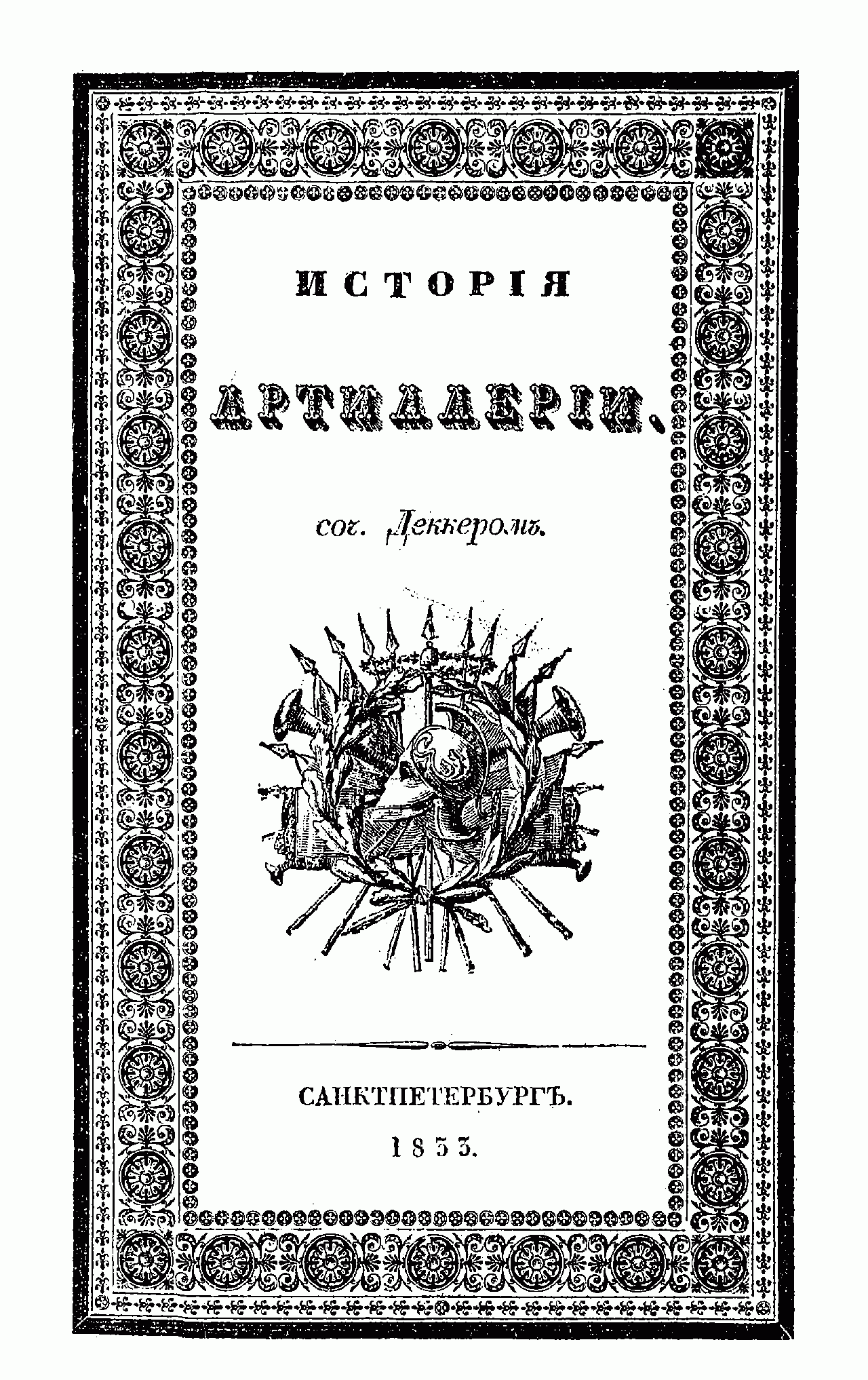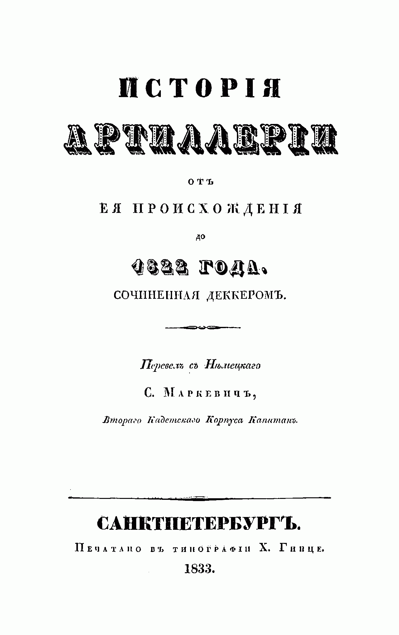 Это редкое военно-историческое издание представляет собой одну из первых популярных работ, вышедших на русском языке в переводе с немецкого, по истории возникновения артиллерии как особого рода войск. Его автор известный прусский военный теоретик, писатель генерал Карл фон Деккер (1784-1844) – в молодости был участником войн с Наполеоном, служил в армии короля Пруссии и даже был награжден в 1814 г. императором Александром I в числе других офицеров русским орденом Святого Владимира 4-й степени, за личное мужество, проявленное в сражениях с французскими оккупантами. В дальнейшем произведенный в майоры К. фон Деккер был причислен к прусскому Генеральному штабу и назначен преподавателем в Генеральное военное училище, а также в течение двух лет читал лекции в артиллерийской и инженерной школах в Берлине. В ходе своей преподавательской деятельности им были подготовлены популярные очерки по военной истории, одним из которых и являлась данная работа по истории артиллерии, впервые вышедшая в свет в Берлине в 1816 г. (Её оригинальное название «Die Artillerie für alle Waffen» (Berlin 1816). В связи с созданием в России в 1832 г. Академии Генерального штаба появилась острая необходимость в подготовке учебных пособий. Таким изданием и стал перевод книги К. фон Деккера. Вышедшая в свет в 1833 г., как утверждается в этой книге, «полная история артиллерии», переведенная с немецкого языка, была подготовлена капитаном Семёном Андреевичем Маркевичем, служившим инспектором во 2-м кадетском корпусе. При переводе на русский язык часть сведений, относящихся исключительно к прусской артиллерии, была заменена им на историю российской артиллерии. Переводчиком была также составлена фактически первая в отечественной военно-исторической науке полная библиография трудов по истории артиллерии, опубликованных к этому времени на русском языке, включая легендарный «Устав ратных, пушечных и других дел…», написанный на основе зарубежных изданий еще в 1607 г. мастером Печатного приказа Онисимом Михайловым (Радишевским) и изданный в 1777-1781 гг.