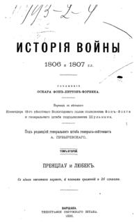 Перевод на русский язык фундаментального многотомного военно-исторического труда по истории войны русско-прусского союза с Наполеоном в 1806-1807 годах, написанного немецким военным историком Оскаром фон Леттов-Форбеком, был подготовлен при штабе Варшавского военного округа под руководством генерал-лейтенанта Генерального штаба, профессора военной истории академии Генерального штаба А.К. Пузыревского, получив при этом одобрение Военного министерства. Деятельность А.К. Пузыревского как одного из выдающихся военных педагогов и просветителей получила в России широкую известность. Представленное им исследование немецкого военного писателя, снабженное многочисленными картами и схемами боевых действий, сих пор представляет научный интерес. Одним из важнейших достоинств данного исследования является то, что автор широко использовал богатейший документальный массив как прусских, так и французских военных архивов, создав объективную картину одного из сложнейших этапов эпохи наполеоновских войн. Русско-прусско-французская война 1806-1807 гг. война между 4-й коалицией европейских держав (Великобритания, Россия, Пруссия, Саксония, Швеция) и наполеоновской Францией. Фактически эти две кампании являлась продолжением русско-австро-французской войны 1805 г. Не имея общего плана войны, союзники действовали несогласованно, что позволило Наполеону разбить их поочерёдно. Так 2 (14) октября 1806 г. в масштабном сражении под Йеной и Ауэрштадтом французская армия разгромила прусско-саксонские войска, после чего наполеоновские войска оккупировали большую часть Пруссии и 12 (24) октября заняли Берлин. Русская армия в составе трёх корпусов (около 160 тыс. чел.) под командованием генерал-фельдмаршала М. Ф. Каменского сосредоточилась в районе Пултуск, Остроленка, Брест-Литовск, выдвинув передовые отряды к Висле. 16 (28) ноября французские войска заняли Варшаву. Наполеон предпринял попытку окружить главные силы русских войск, но 14 (26) декабря в сражении под Пултуском русские войска сорвали этот план, нанеся поражение корпусу маршала Ж. Ланна. Затем русская армия отошла в район Тыкоцина, а наполеоновские войска расположились на зимние квартиры. 4 (16) января 1807 русская армия под командованием нового командующего генерал-адъютанта Л.Л. Беннигсена начала наступление из района Бялы в Восточную Пруссию с целью не допустить занятия французами Кенигсберга и Пиллау и нанести поражение изолированным корпусам Нея и Бернадота. Наполеон, узнав о продвижении русских войск, 20 января (1 февраля) направил главные силы на север, пытаясь обойти левый фланг русской армии и отрезать экспедиционные силы русских от России. Русские войска, ведя арьергардные бои, отошли к Прейсиш-Эйлау, где 26–27 января (7– 8 февраля) произошло встречное упорное сражение, в котором русские войска успешно отразили удары наполеоновской армии. 2 (14) июня 1807 г. в сражении под Фридландом русская армия, проявив чудеса героизма и мужества, вследствие неадекватных мер командования, была вынуждена отступить. В июне 1807 г. состоялось свидание Наполеона с императором Александром I в Тильзите и был подписан тяжёлый для России вынужденный союзный договор с наполеоновской Францией. Все эти военно-исторические события детально изложены в данном труде.