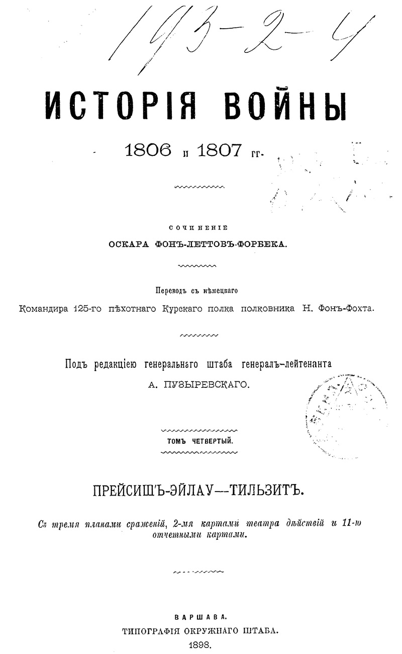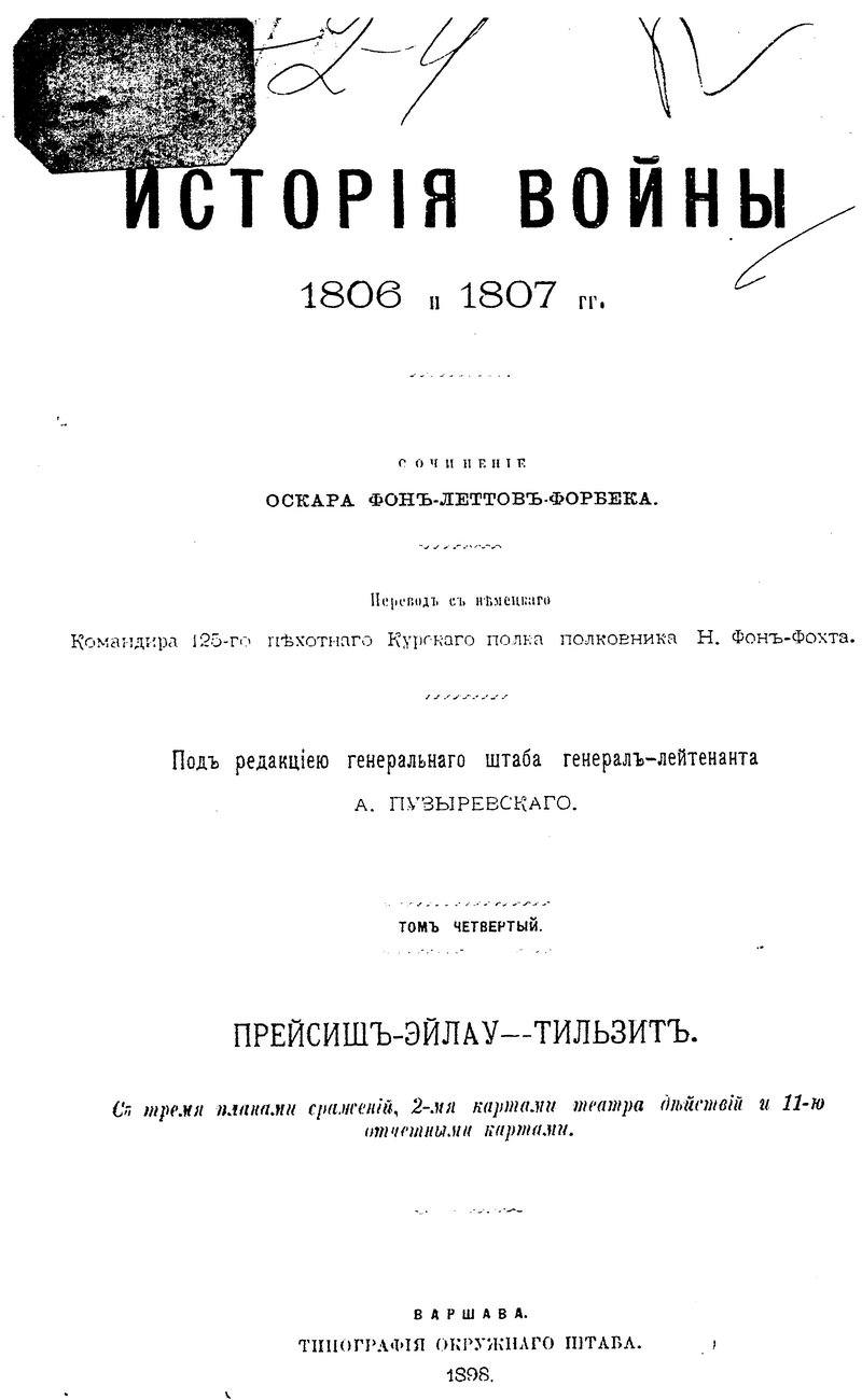 Перевод на русский язык фундаментального многотомного военно-исторического труда по истории войны русско-прусского союза с Наполеоном в 1806-1807 годах, написанного немецким военным историком Оскаром фон Леттов-Форбеком, был подготовлен при штабе Варшавского военного округа под руководством генерал-лейтенанта Генерального штаба, профессора военной истории академии Генерального штаба А.К. Пузыревского, получив при этом одобрение Военного министерства. Деятельность А.К. Пузыревского как одного из выдающихся военных педагогов и просветителей получила в России широкую известность. Представленное им исследование немецкого военного писателя, снабженное многочисленными картами и схемами боевых действий, сих пор представляет научный интерес. Одним из важнейших достоинств данного исследования является то, что автор широко использовал богатейший документальный массив как прусских, так и французских военных архивов, создав объективную картину одного из сложнейших этапов эпохи наполеоновских войн. Русско-прусско-французская война 1806-1807 гг. война между 4-й коалицией европейских держав (Великобритания, Россия, Пруссия, Саксония, Швеция) и наполеоновской Францией. Фактически эти две кампании являлась продолжением русско-австро-французской войны 1805 г. Не имея общего плана войны, союзники действовали несогласованно, что позволило Наполеону разбить их поочерёдно. Так 2 (14) октября 1806 г. в масштабном сражении под Йеной и Ауэрштадтом французская армия разгромила прусско-саксонские войска, после чего наполеоновские войска оккупировали большую часть Пруссии и 12 (24) октября заняли Берлин. Русская армия в составе трёх корпусов (около 160 тыс. чел.) под командованием генерал-фельдмаршала М. Ф. Каменского сосредоточилась в районе Пултуск, Остроленка, Брест-Литовск, выдвинув передовые отряды к Висле. 16 (28) ноября французские войска заняли Варшаву. Наполеон предпринял попытку окружить главные силы русских войск, но 14 (26) декабря в сражении под Пултуском русские войска сорвали этот план, нанеся поражение корпусу маршала Ж. Ланна. Затем русская армия отошла в район Тыкоцина, а наполеоновские войска расположились на зимние квартиры. 4 (16) января 1807 русская армия под командованием нового командующего генерал-адъютанта Л.Л. Беннигсена начала наступление из района Бялы в Восточную Пруссию с целью не допустить занятия французами Кенигсберга и Пиллау и нанести поражение изолированным корпусам Нея и Бернадота. Наполеон, узнав о продвижении русских войск, 20 января (1 февраля) направил главные силы на север, пытаясь обойти левый фланг русской армии и отрезать экспедиционные силы русских от России. Русские войска, ведя арьергардные бои, отошли к Прейсиш-Эйлау, где 26–27 января (7– 8 февраля) произошло встречное упорное сражение, в котором русские войска успешно отразили удары наполеоновской армии. 2 (14) июня 1807 г. в сражении под Фридландом русская армия, проявив чудеса героизма и мужества, вследствие неадекватных мер командования, была вынуждена отступить. В июне 1807 г. состоялось свидание Наполеона с императором Александром I в Тильзите и был подписан тяжёлый для России вынужденный союзный договор с наполеоновской Францией. Все эти военно-исторические события детально изложены в данном труде.