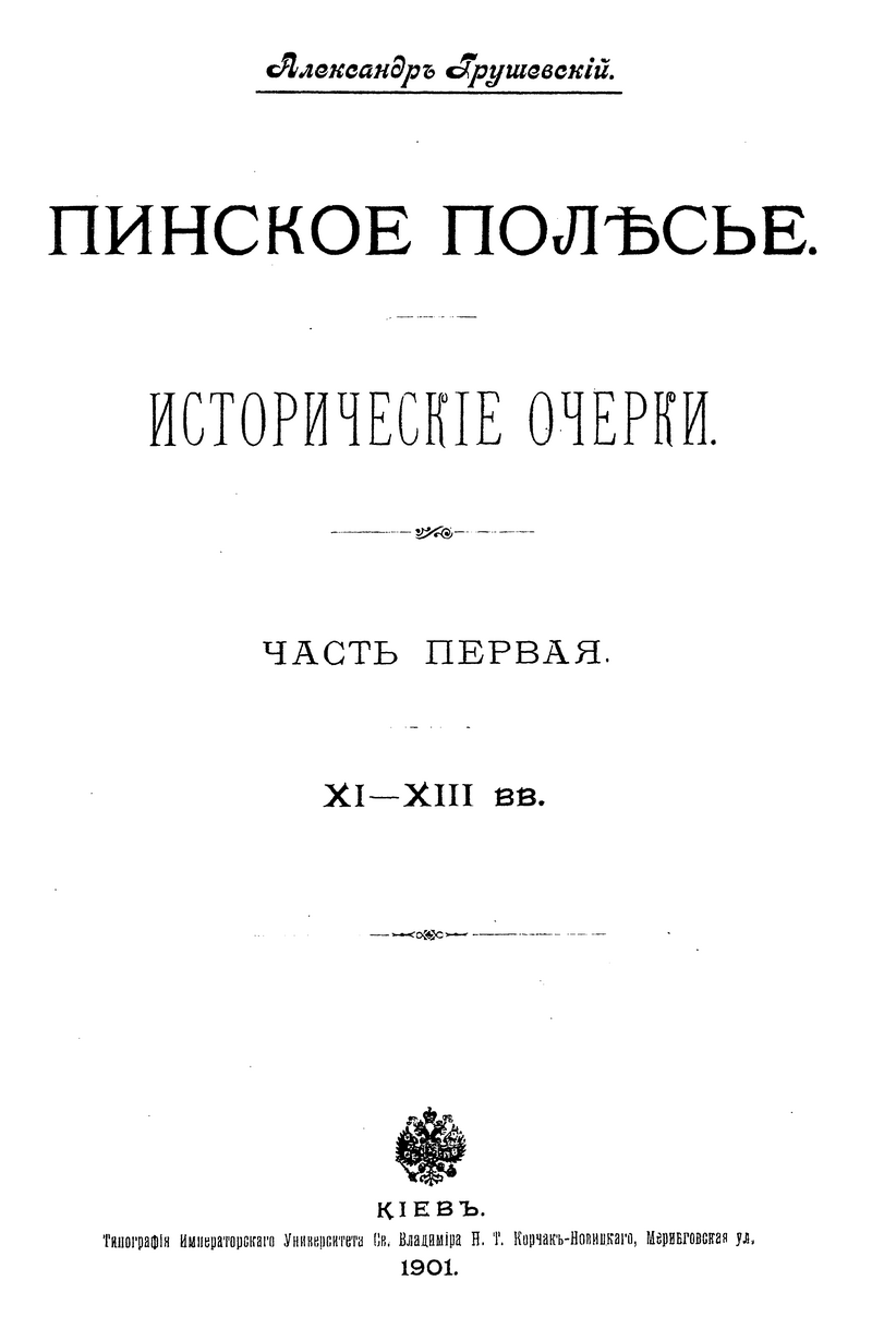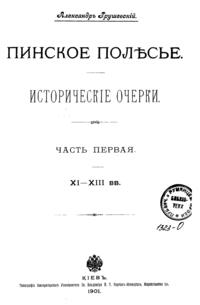 На историко-филологическом факультете Киевского университета св. Владимира в конце XIX в. велась серьёзная научная работа по изучению истории Древней Руси. Результатом этой работы явилась серия областных монографий. В эту серию входит и предлагаемое исследование Александра Грушевского. Его первая часть знакомит с историей Турово-Пинского княжества XI – XIII, находившегося в бассейне реки Припять.