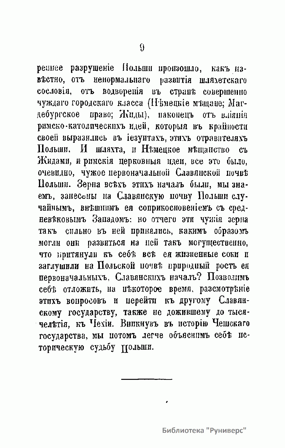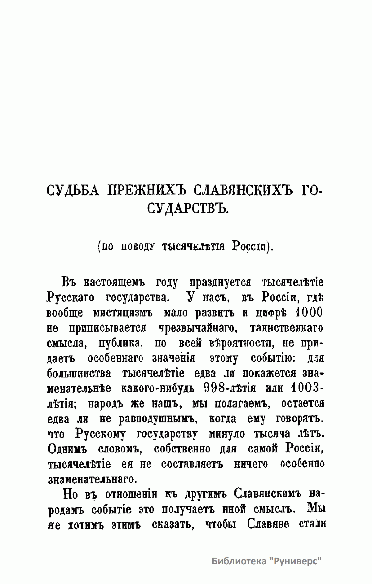 Популярная занимательная брошюра, посвященная предстоявшему в 1862 г. торжественному празднованию 1000-летия российской государственности (Тысячелетию России) принадлежит перу выдающегося отечественного славяноведа, прекрасного знатока истории, культуры, языка и верований славянских народов Александру Федоровичу Гильфердингу, автору значительных исследований в области общеславянской филологии. Автор, отмечая уникальность российской государственности, в весьма простой и доступной форме на примерах других славянских народов (государственных образований – мораван, чехов, поляков, словаков, хорватов, болгар и сербов), проводит сравнительный анализ причин распада славянских государств. Автор подробно останавливается на описании истории Чехии, оказавшейся, как и Польское государство, в орбите католической церкви и западноевропейской цивилизации в целом. Это «губительное», по мнению Гильфердинга, цивилизационное влияние настойчиво подавляло «стихию славянского начала», когда «Чешское государство стояло на высоте своего политического могущества». Именно этого удалось избежать российской национальной культуре, не подвергавшейся столь сильному влиянию западноевропейской (римско-католической, а затем протестантской) традиции, что и позволило восточнославянскому этносу сохранить свою самобытную государственность, достигнув тысячелетнего существования. Популярное исследование Гильфердинга весьма актуально в нынешних условиях преобразования современной России, отмечающей 1150-летие создания своей государственности.