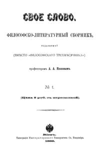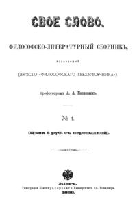 Сборник, который философ-спиритуалист А.А. Козлов - один из первых представителей персонализма в России, начал выпускать вместо выходившего ранее журнала «Философский трехмесячник». Как и предшествующее издание, « Свое слово» состоит исключительно из статей самого автора. В этих публикациях он в итоговой форме формулирует свои философские воззрения, в которых развивает концепцию панпсихизма.