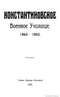 Брошюра представляет собой краткое учебное пособие для занятий с юнкерами, выпущенное в месте постоянной дислокации остатков сохранившихся частей Вооруженных Сил Юга России в изгнании на территории Болгарии. В предисловии указывается, что из всех военных училищ дореволюционной России только одно это военно-учебное заведение сохранилось до 1922 года, продолжая готовить офицерские кадры даже в условиях эмиграции. В пособии в форме хроники прослеживаются основные вехи истории Константиновского военного училища. Училище было основано в 1865 году как Киевское пехотное юнкерское училище. В 1897 году оно было преобразовано в Киевское военное училище для войсковых юнкеров и вольноопределяющихся с недостаточным образованием, Общее количество юнкеров насчитывало 400 чел. После начала Первой мировой войны – с 1 октября 1914 года состоялся последний выпуск юнкеров в чин подпоручика. В дальнейшем училище перешло к практике четырехмесячных ускоренных выпусков, его штат был увеличен до 630 юнкеров. В это время в Киеве было открыто еще 3 военных училища, поэтому в сентябре 1914 года училищу было присвоено наименование «1-го Киевского». После смерти великого князя Константина Константиновича в октябре 1915 года 1-е Киевское военное училище стало именоваться «Киевским великого князя Константина Константиновича военным училищем». После Октябрьских событий 1917 года 2 роты училища выступили против власти большевиков. Поэтому в ноябре 1917 года училище переместилось в Екатеринодар и полностью влилось в создаваемую Добровольческую армию, которую вскоре возглавил генерал А.И. Деникин, тоже бывший константиновец. Юнкера на протяжении трех лет кровопролитной «белой борьбы» принимали активное участие в Гражданской войне на Юге России, а в ноябре 1920 года ввиду полной эвакуации Крыма училище покинуло Родину. Последний – 69-й – выпуск училища состоялся уже в 1923 году в определенных властями Болгарии лагерях близ македонского селения Горная Джумая.
