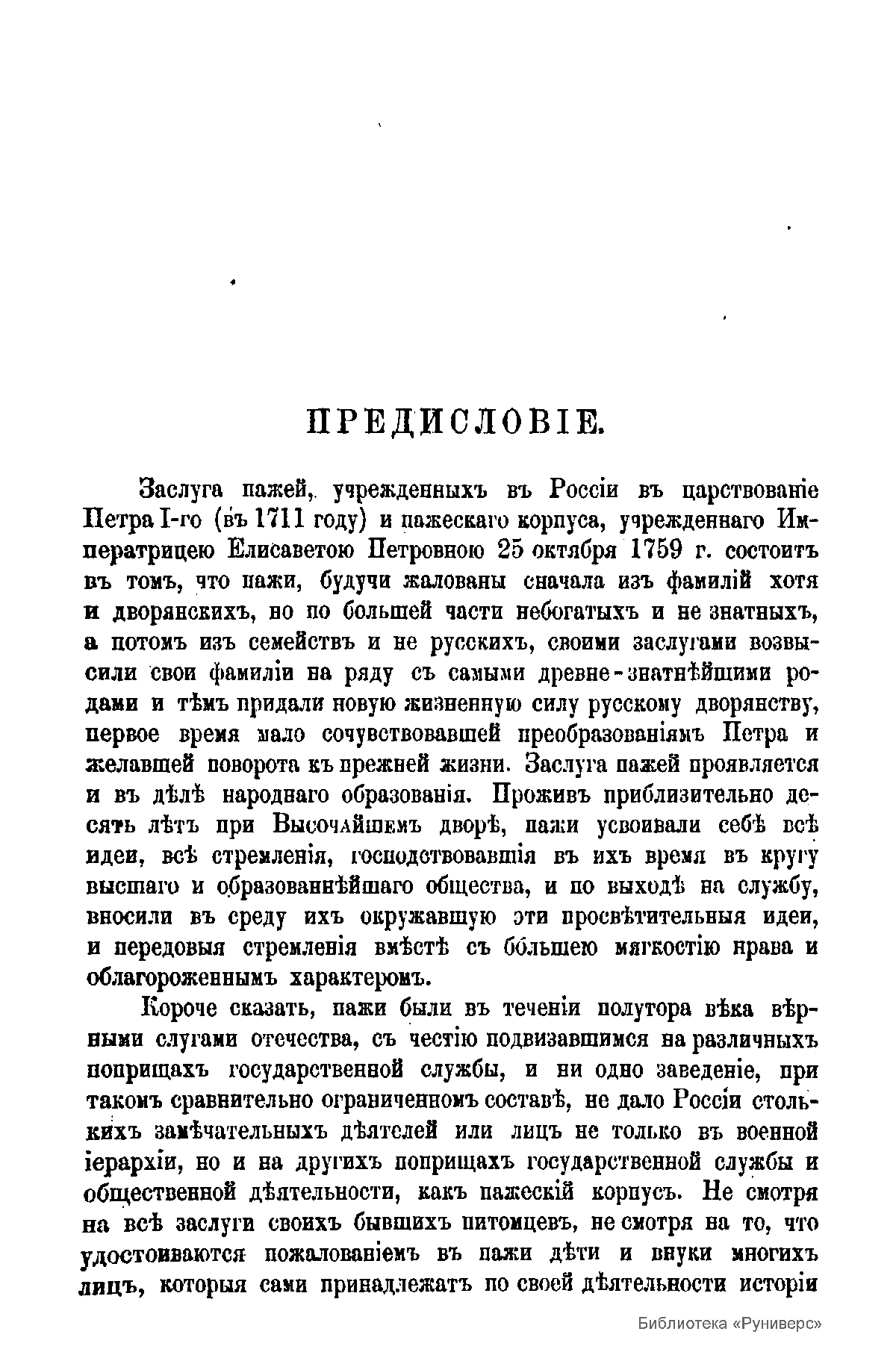 Автор работы, один из представителей известного дворянского рода графов Милорадовичей Григорий Александрович Милорадович (1834–1905) – генерал-лейтенант, сенатор, историк, выпускник Пажеского корпуса 1857 года, принимал участие в коронационных торжествах по случаю восшествия на престол Александра II. В своем предисловии к данной книге он отмечает, что Пажеский корпус, возникший в России как элитное учебное заведение при императорском дворе, до сих пор не получил своей истории, хотя миновал и свое 50-летие и столетие со времени основания. Пажи при царском дворе впервые появились в России в 1711 году, после неудачного Прутского похода, ими назначались дети придворных и офицеров гвардии. После кончины Петра Великого на придворной церемониальной службе находились уже 14 пажей и 6 камер-пажей, из дворянских родов. Непосредственным же предшественником корпуса была Пажеская придворная школа, созданная указом от 5 апреля 1742 году. В конце своего царствования Елизавета Петровна повелела графу И.И. Шувалову подготовить проект статуса Пажеского корпуса. 25 октября (5 ноября по н.ст.) 1759 года корпус был учрежден и началось систематическое обучение пажей. В программу их обучения входило изучение немецкого, латинского и французского языков, физики, географии, геометрии, алгебры, фортификации, истории, геральдики. В штат Корпуса изначально составлял 9 камер-пажей и 40 пажей. Екатерина II в 1762 году своим указом запретила приём в корпус отроков недворянского происхождения, тогда же гофмейстером (директором) Пажеского Корпуса был назначен Ф. Ротштейн, а в 1779 году его сменил секунд-майор Ф. Н. Шевалье-де-Вильно, который находился на этом посту до 1797 года. В 1765 году знаменитым историографом Г.Ф. Миллером, была составлена новая программа обучения пажей. Они стали изучать математические и военные науки, философию, мораль, право, историю, географию, генеалогию, юриспруденцию, государственный церемониал, русский и иностранный языки, каллиграфию, а также верховую езду, танцы и фехтование. В царствование Александра I была проведена серьезная реорганизация Пажеского корпуса и в 1802 году он был преобразован в элитное военно-учебное заведение, а в 1819 году был подчинен главному директору кадетских корпусов. При Николае I штат обучавшихся в Корпусе вырос до 150 человек, были изданы правила о порядке зачисления в пажи. В соответствии с ними в пажи зачислялись только дети лиц первых трех классов Табели о рангах (не ниже генерал-лейтенанта или тайного советника) и только по высочайшему повелению. Прием осуществлялся на основании строгих конкурсных вступительных экзаменов. Обучение длилось в течение семи лет, в том числе два года в специальных классах. Пажи, не удовлетворявшие требованиям перевода в специальные классы, увольнялись с правами окончивших военные гимназии. Окончившие специальные классы разделялись на четыре разряда по итогам обучения и выпускались: 1-й разряд – подпоручиками и корнетами в гвардию; 2-й разряд – подпоручиками или корнетами в армейские части с одним годом старшинства; 3-й разряд – теми же чинами в армию без старшинства; 4-й разряд – унтер-офицерами в армию на шесть месяцев с дальнейшим производством в офицеры. Преподавание в Корпусе велось на высоком уровне. Там читали курс не только корпусные преподаватели, но и профессура университета и высших 