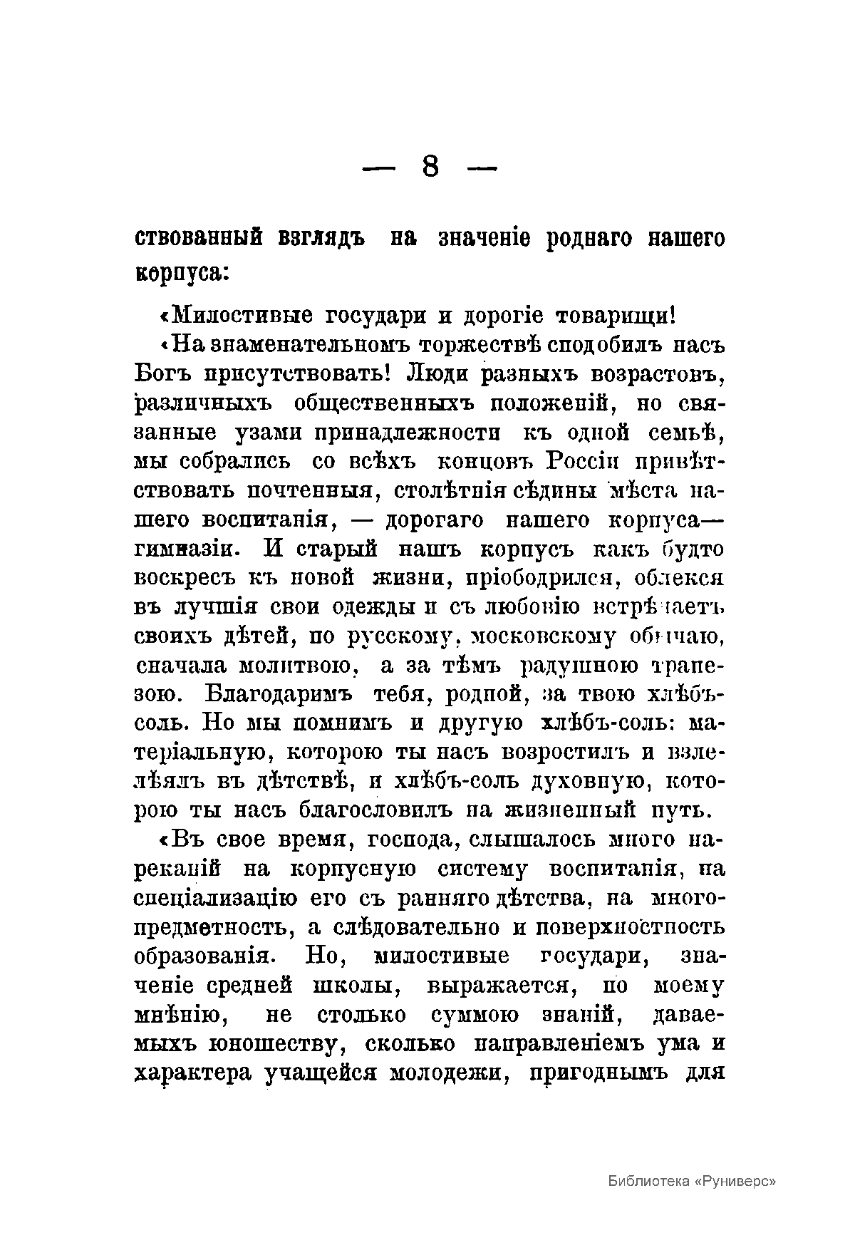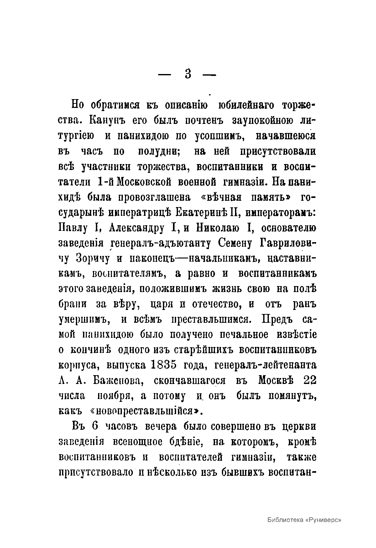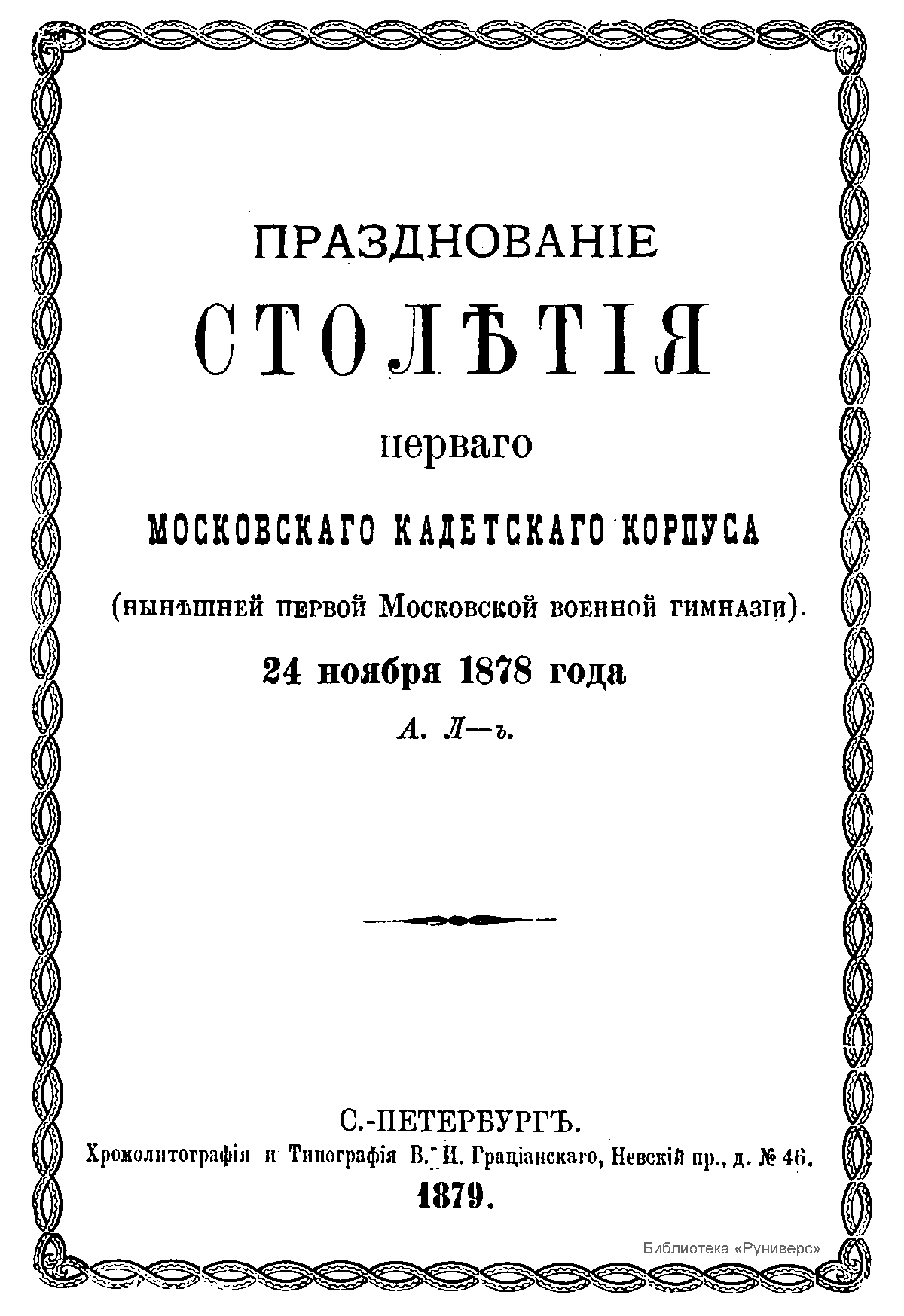 Данное издание посвящено празднованию 100-летнего юбилея 1-го Московского кадетского корпуса (под разными наименованиями - 1778 – 1918 гг.). Здесь дано подробное описание торжеств, цитируются речи выступающих. В программе торжеств указаны присутствовавшие на них выпускники, среди которых имена известных военных деятелей России 2-й половины XIX в., а также перечисляются выпускники – кавалеры Ордена Святого Георгия с указанием повода их награждения.