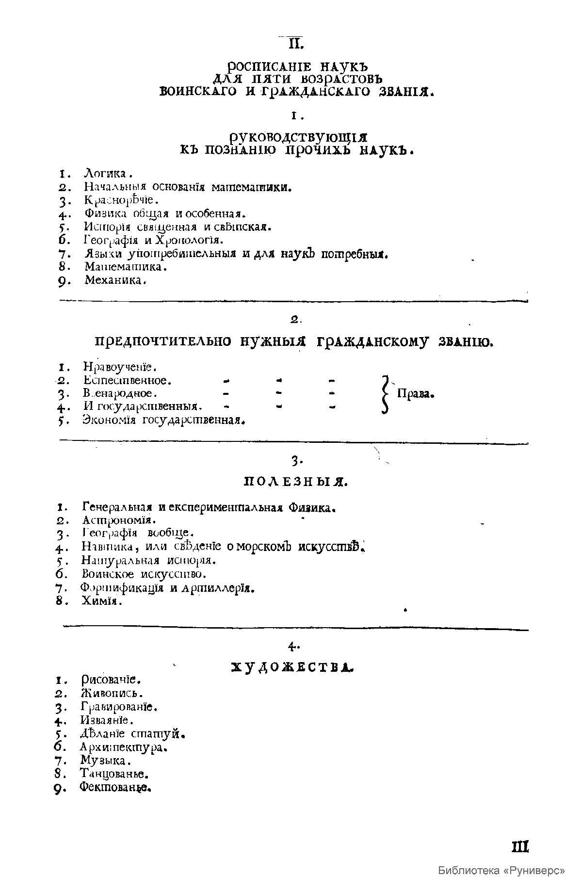 Вниманию читателей представлено первое издание Устава Императорского сухопутного шляхетного кадетского корпуса (под разными названиями – 1732 – 1918 гг.), который было составлен в 1766 г. его шефом, генералом-поручиком И.И. Бецким. Устав вводил 5 возрастов, каждый состоял из 5 отделений, где обучались и дворянские дети, и гимназисты - то есть дети разночинцев. Из гимназистов предполагалось готовить преподавателей для корпуса. Дворяне и разночинцы должны были воспитываться и обучаться на равных правах. Этим Бецкой намеревался сблизить представителей молодого поколения различных сословий и исключить в будущем разногласий между ними. Устав кадетского корпуса устанавливал основы не только профессионального обучения, но и нравственного воспитания кадетов, что отвечало принципам Эпохи Просвещения.