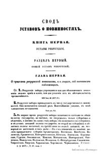 Свод законов Российской империи— официальное собрание расположенных в тематическом порядке действующих законодательных актов Российской империи, созданное при Николае I. Впервые он был напечатан в 1832 году. Манифестом 31 января 1833 года Свод законов был объявлен действующим источником права с 1 января 1835 года. Первое издание 1832 года и последующие 1842-го и 1857 года состояли из пятнадцати томов. После 1857 года Свод законов полностью не переиздавался, а выходили лишь отдельные тома. В качестве отдельного – 16-го тома в 1885 году вышли Судебные уставы. Между изданиями Свода законов выходили ежегодные и сводные (за несколько лет) «Продолжения» Свода законов с указанием на упраздненные и измененные статьи. В своде законов собраны все реально действовавшие в определенный момент времени законы по тем или иным проблемам права, это справочник для юристов. Отбор законодательного материала для включения в Свод производился на основе Полного собрания законов (первое Полное собрание законов, появившееся в 1830 году, состояло из 45 томов, содержащих 30 920 актов и 6 томов приложений). Собрание законов – это в большой степени историческое издание. По нему можно изучать развитие, направление правительственной мысли в стране. Это летопись отечественного законотворчества. Изучая страницу за страницей эту летопись, мы можем узнать, что в тот или иной момент истории являлось злобой дня.