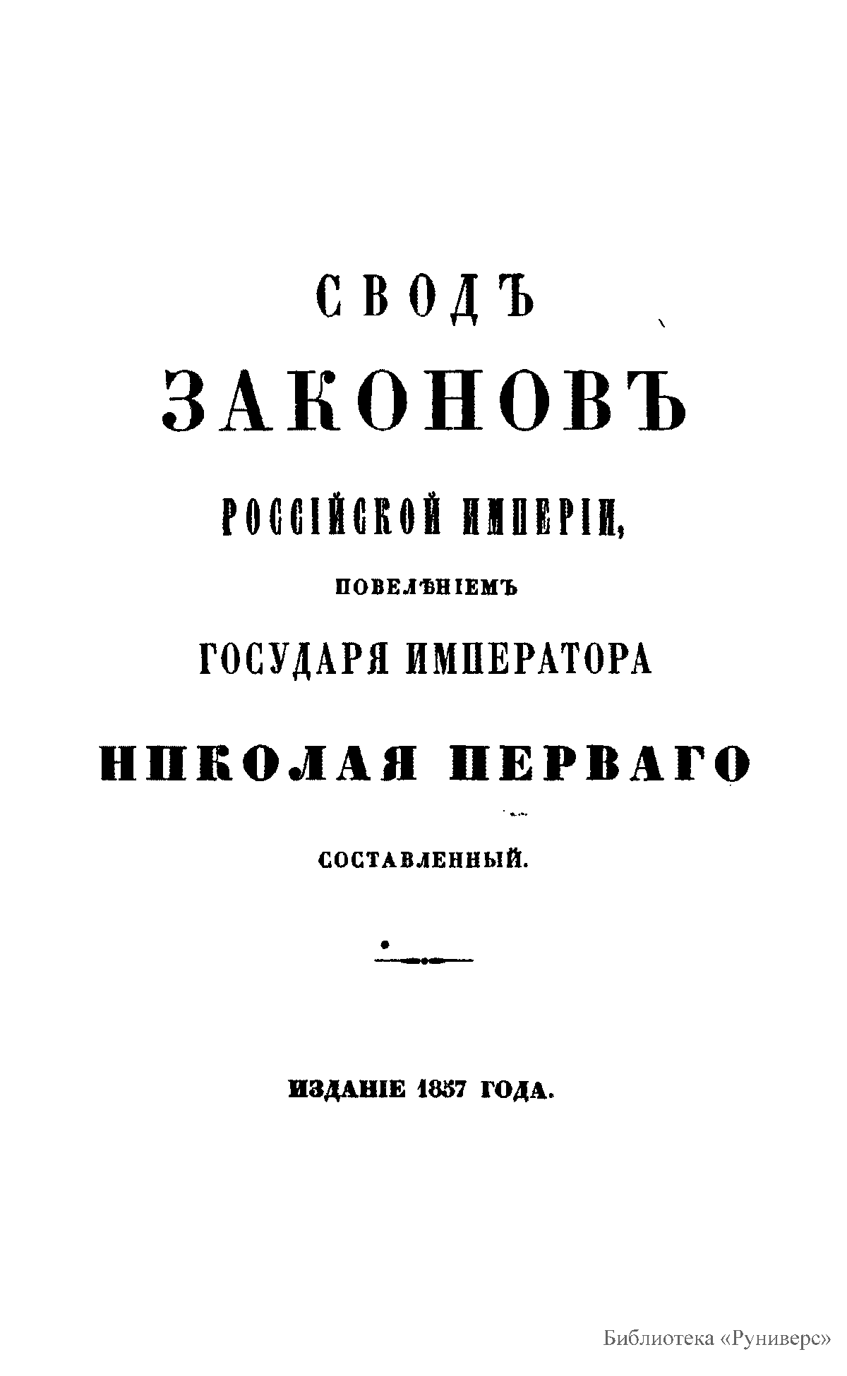 Свод законов Российской империи— официальное собрание расположенных в тематическом порядке действующих законодательных актов Российской империи, созданное при Николае I. Впервые он был напечатан в 1832 году. Манифестом 31 января 1833 года Свод законов был объявлен действующим источником права с 1 января 1835 года. Первое издание 1832 года и последующие 1842-го и 1857 года состояли из пятнадцати томов. После 1857 года Свод законов полностью не переиздавался, а выходили лишь отдельные тома. В качестве отдельного – 16-го тома в 1885 году вышли Судебные уставы. Между изданиями Свода законов выходили ежегодные и сводные (за несколько лет) «Продолжения» Свода законов с указанием на упраздненные и измененные статьи. В своде законов собраны все реально действовавшие в определенный момент времени законы по тем или иным проблемам права, это справочник для юристов. Отбор законодательного материала для включения в Свод производился на основе Полного собрания законов (первое Полное собрание законов, появившееся в 1830 году, состояло из 45 томов, содержащих 30 920 актов и 6 томов приложений). Собрание законов – это в большой степени историческое издание. По нему можно изучать развитие, направление правительственной мысли в стране. Это летопись отечественного законотворчества. Изучая страницу за страницей эту летопись, мы можем узнать, что в тот или иной момент истории являлось злобой дня.