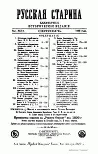 «Русская старина», ежемесячный исторический журнал, выходил в Петербурге в 1870-1918. Основан, издавался и редактировался (1870-1892) М. И. Семевским при участии В. И. Семевского. Последующими редакторами были Н. К. Шильдер (1892-1896), Н. Ф. Дубровин (1896-1904), военные историки С. П. Зыков, П. Н. Воронов.