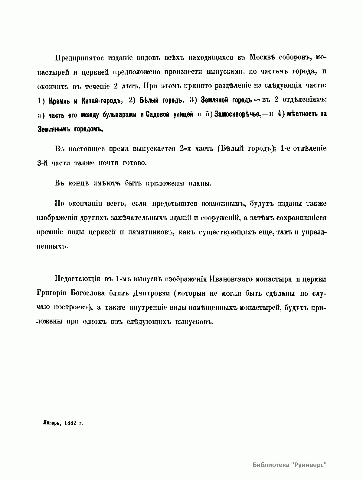 Цель настоящего издания сохранить на память будущему вида существовавших во второй половине девятнадцатого века в Москве храмов, не касаясь при этом того, какое значение они имеют в отношении историческом, археологическом или архитектурном. Местоположение большинства храмов было неудобно для фотографической съемки, поэтому автору не удалось сделать все снимки в одинаковом относительно действительности размере. Издание разделено на четыре части. 1. Кремль и Китай-город – 33 изображения. 2. Белый город – 59 изображений. 3. Земляной город в двух отделениях: а) его часть по левую сторону Москвы-реки – 72 изображения, б) часть Замоскворецкая – 36 изображений. 4. Местность за Земляным городом – 73 изображения. Приложенный к каждой части текст составляет оглавление.